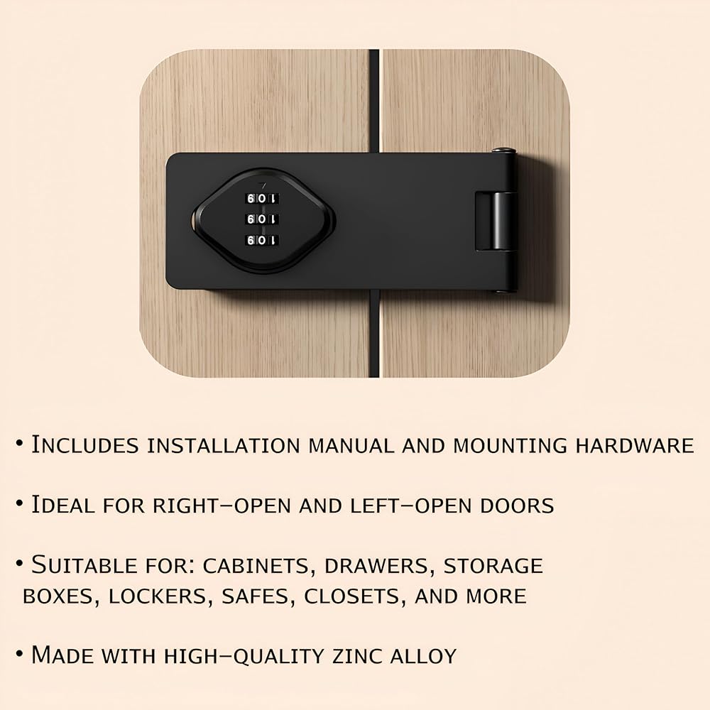 If you are looking for a secure and innovative door latch for your cabinets, this combination lock is the way to go! Featuring an ingenious 3-digit passcode system and a heavy-duty zinc alloy construction, this cabinet latch protects your belongings and gives only limited access to drawers or cabinets! The door latch is super easy to install and can be used to secure your valuables or prevent small children, unwanted guests, or strangers from opening the kitchen drawers, cupboards, cabinets, lockers or storage rooms.