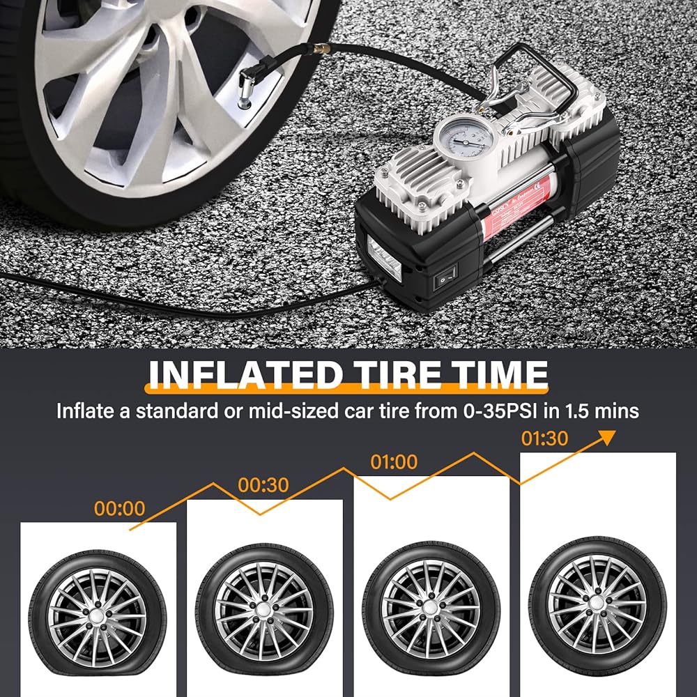 النفخ السريع: أقصى ضغط 150 رطل لكل بوصة مربعة، تدفق الهواء 2.12CFM@0PSI، ينفخ إطار السيارة القياسي في 1.5 دقيقة (195/65/R16، 0-35 رطل لكل بوصة مربعة) مع أسطوانات مزدوجة، ينتج ضاغط الهواء المحمول 12 فولت تدفقًا قدره 70 لتر/دقيقة؛ 4X أسرع من غيرها.