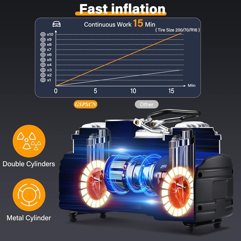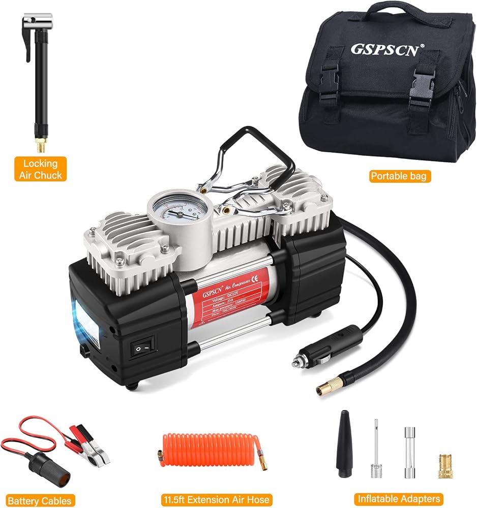 إضاءة LED ساطعة: ضاغط الهواء المحمول GSPSCN بقوة 12 فولت مجهز بمصابيح LED ساطعة وطويلة الأمد، مما يسمح بالتشغيل السهل أو إجراء إصلاحات سريعة في الظلام والتأكد من إمكانية رؤيتك في حالات الطوارئ لتجنب أي مخاطر محتملة.