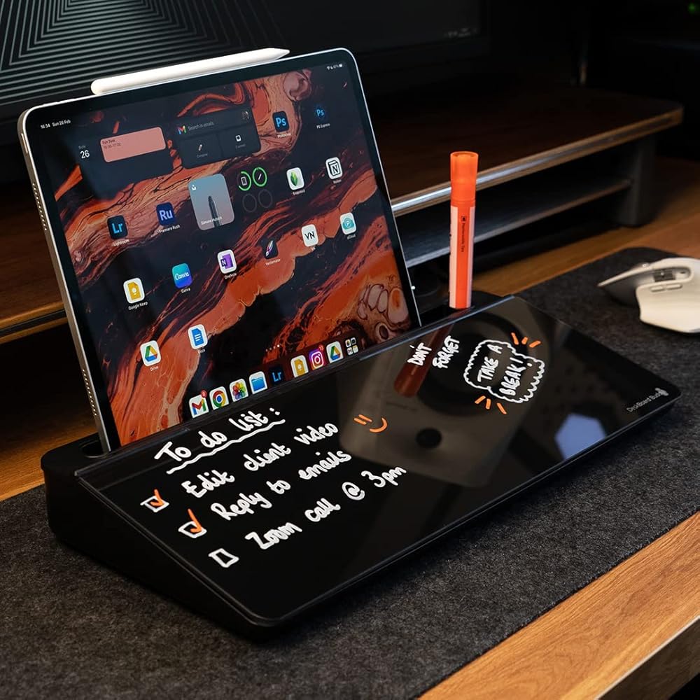 Become more productive and organized at your desk with the DeskBoard Buddy. Perfect for keeping your to-do list and other notes in front of you while you work. It also doubles as a desk organizer with its large internal storage compartment. The perfect place to keep your essential stationery without having it clutter up your desk space. The DeskBoard Buddy also features a phone and tablet stand on the top, so you can keep your device in view while you work. Get yours today and transform the way you work!