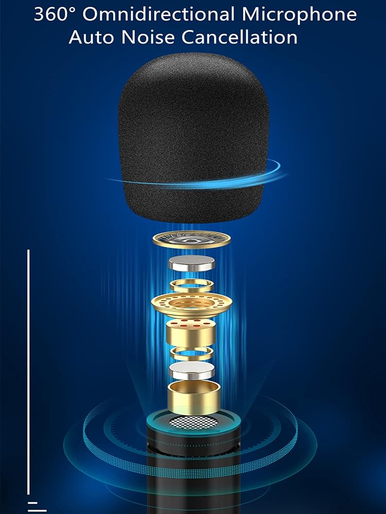 تقليل الضوضاء الذكي والمزامنة التلقائية: مع ميكروفون مكثف متعدد الاتجاهات، فإنه يلتقط الصوت في اتجاه 360. تعمل تقنية تقليل الضوضاء على قطع معظم تداخل الضوضاء ويمكن لتقنية المزامنة التلقائية في الوقت الحقيقي مزامنة الموسيقى الخلفية لجهاز iPhone الخاص بك والصوت البشري في الوقت الفعلي.