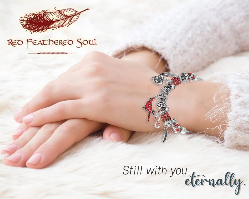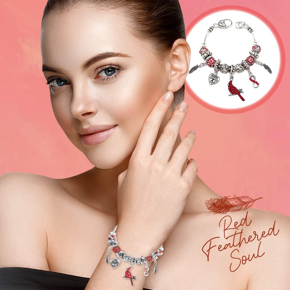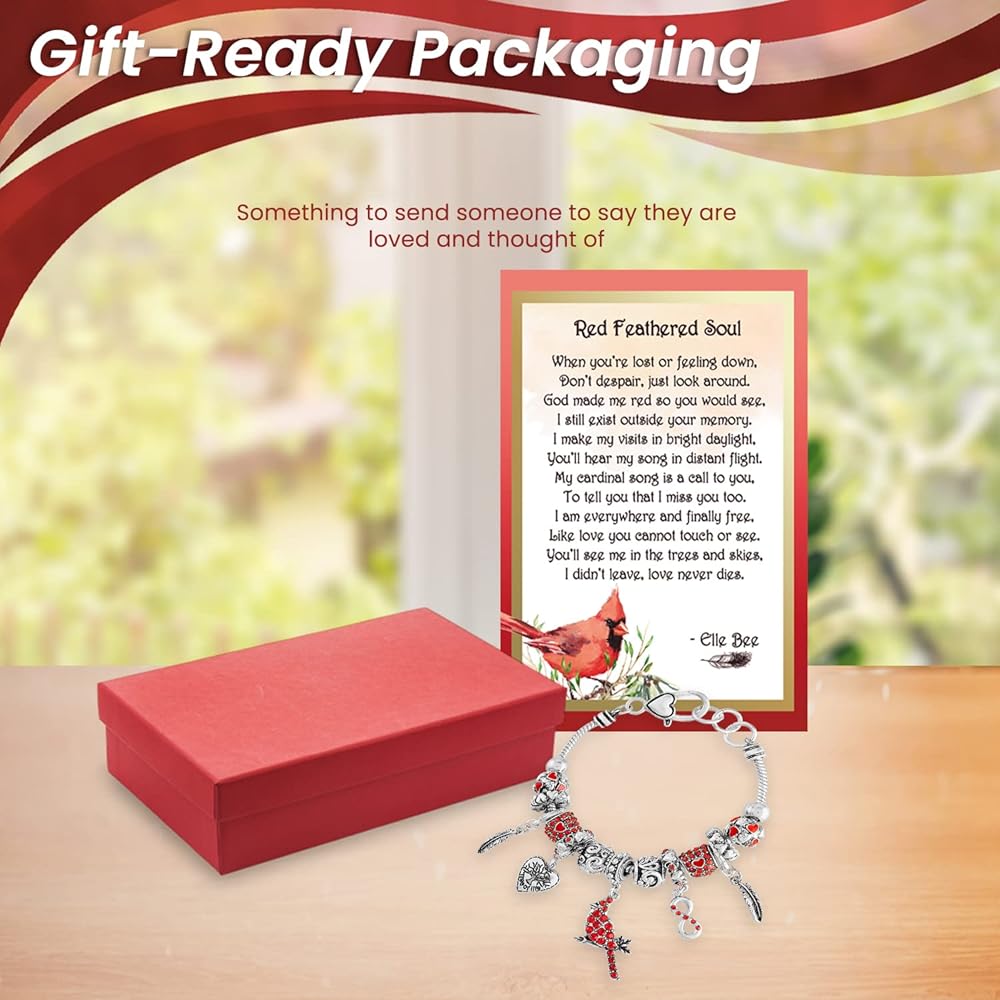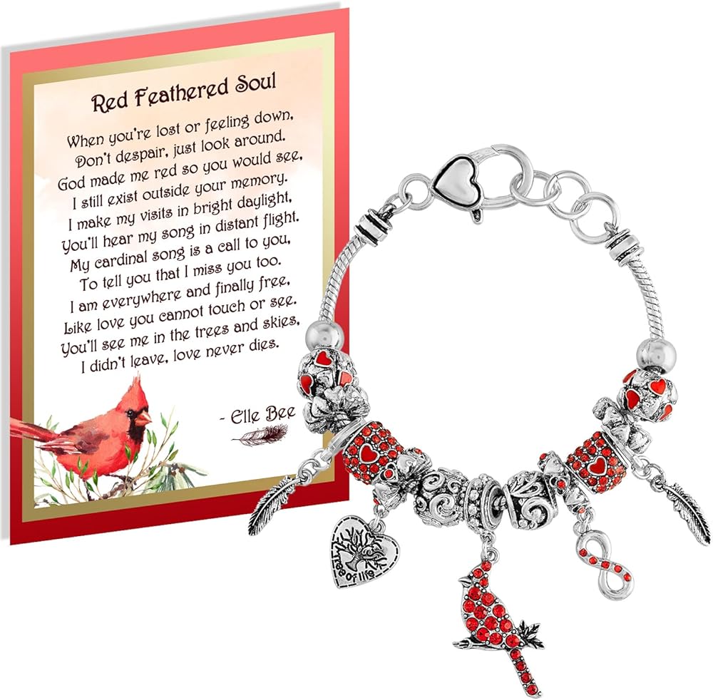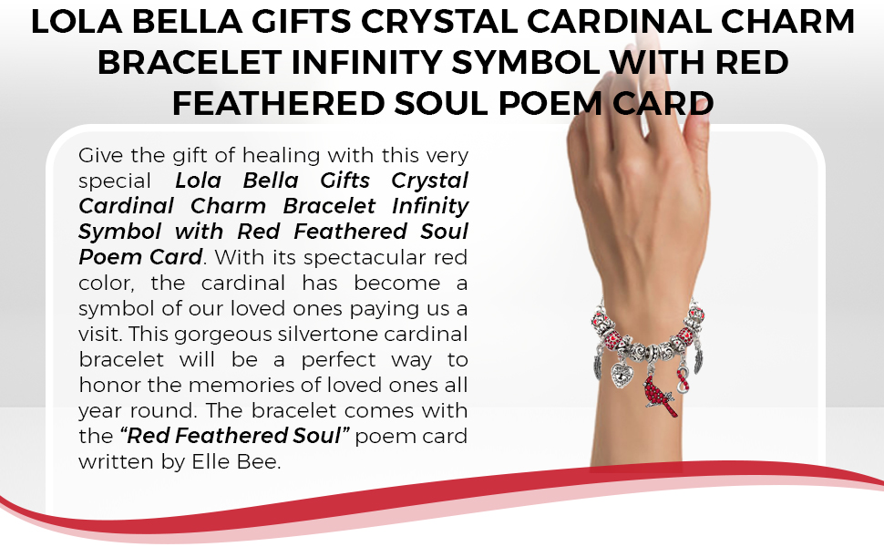 هذا السوار المذهل من Lola Bella Gifts Crystal Cardinal Charm مع بطاقة قصيدة الروح ذات الريش الأحمر سيكون الهدية المثالية لأولئك الذين يفتقدون شخصًا مات، ولكن لا يزال يعيش في قلوبهم. نريد أن نكون شعاع نور وشعاع أمل لأولئك الذين يعانون من الحزن ونذكرهم بأن أحبائهم سيكونون معهم دائمًا بالروح.