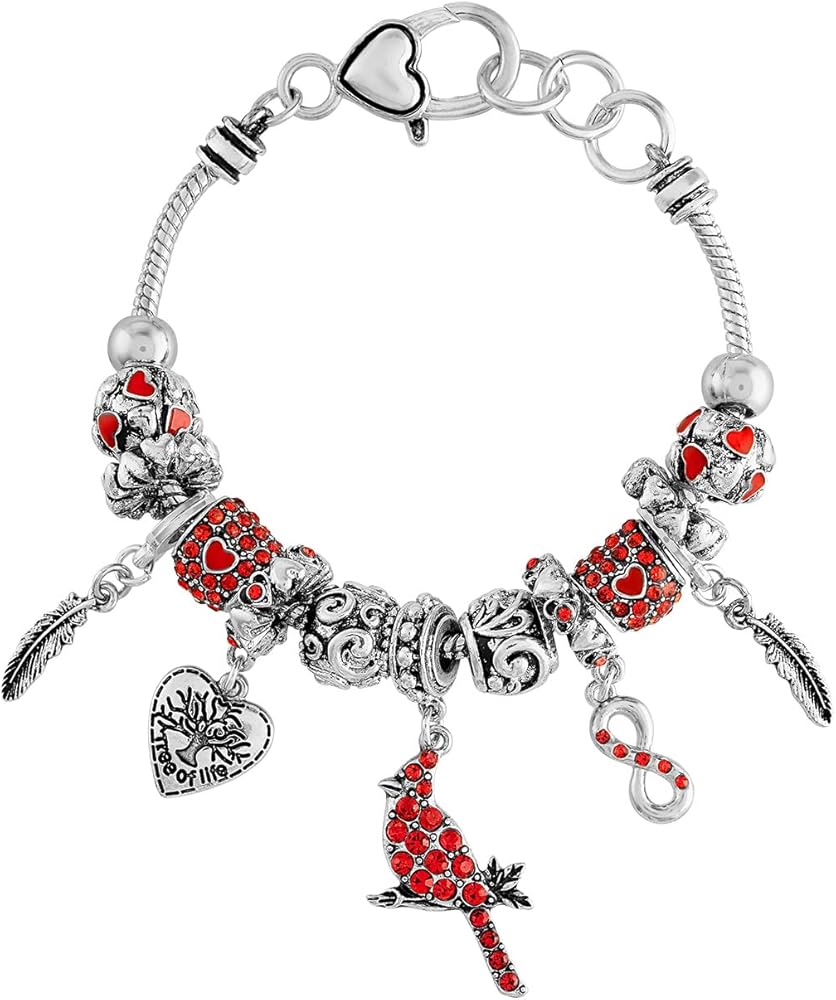 يبلغ طول هذا السوار الكاردينال الفضي الرائع 17.78 سم - 19.05 سم، ويحتوي على مشبك مزدوج لسهولة الارتداء. إنه مزين بحلية كاردينال أنيقة من الكريستال الأحمر يبلغ مقاسها 2.54 سم، بالإضافة إلى حلية رمز لا نهاية لها مفصلة بالكريستال، وشجرة الحياة، وسحر الريشة. إنها حقًا هدية تعاطف مؤثرة ومذهلة أو هدية تذكارية.