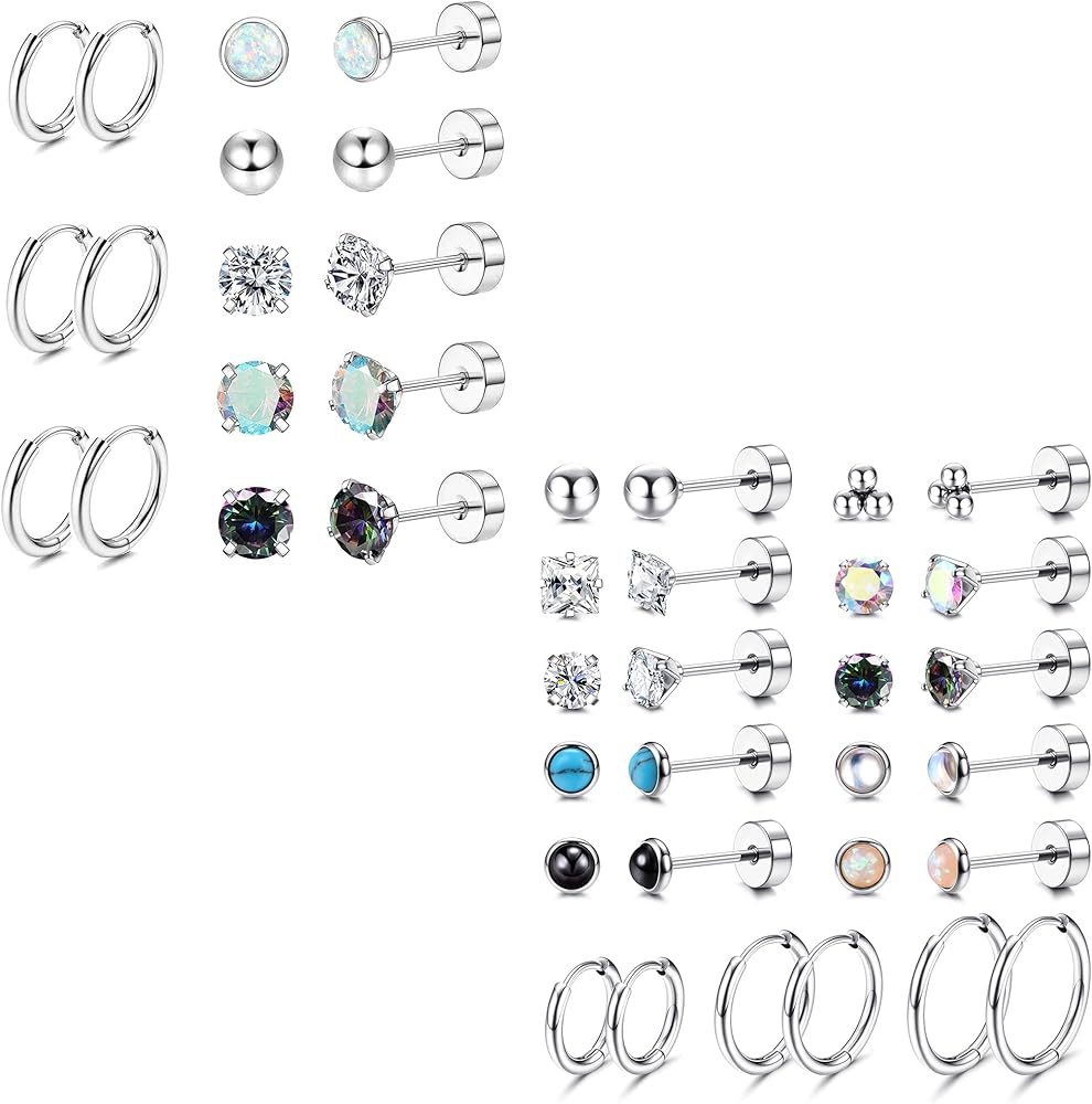 • 💎[Earrings Sets for Multiple Piercing] You will get 15 pairs flat back stud earrings and 6 pairs tiny hoop earrings in different styles, including opal stud earrings, cz stud earrings, ball stud earrings, you aslo can use them as cartilage earrings, upper earlobe earrings, daith earrings, tragus earrings, helix earrings.