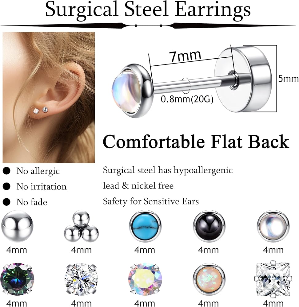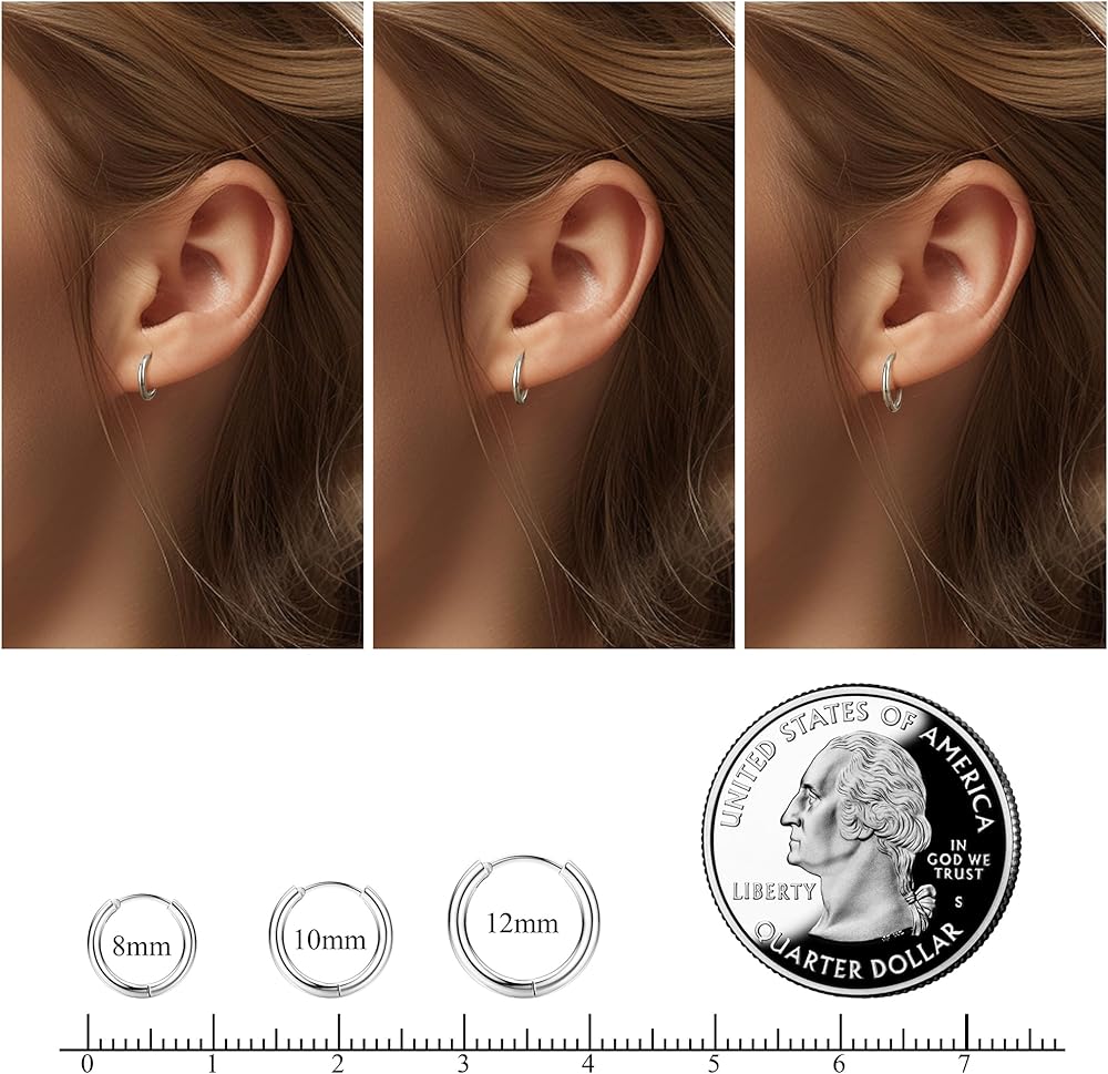 • 💎[Surgical Steel Earrings Size] The flat back earrings and small hoops earrings gauge is 20G (0.8mm), the cute earrings' post length is 6mm, suitable for most ear piercing. To make the convenient for putting on and taking off, the flat back size is 5mm. The hoop huggie earrings' inner diameters are 8mm/10mm/12mm, very suitable for wearing alone and multiple.