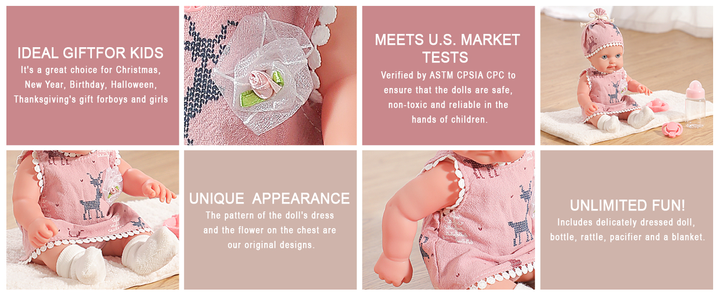 تفاصيل ملابس رائعة: تأتي كل دمية طفل ترتدي ملابس أنيقة وساحرة، مما يضيف لمسة من الجمال إلى وقت اللعب. يضمن الاهتمام بالتفاصيل في الملابس إطلاق العنان لخيال طفلك من خلال المغامرات الإبداعية.