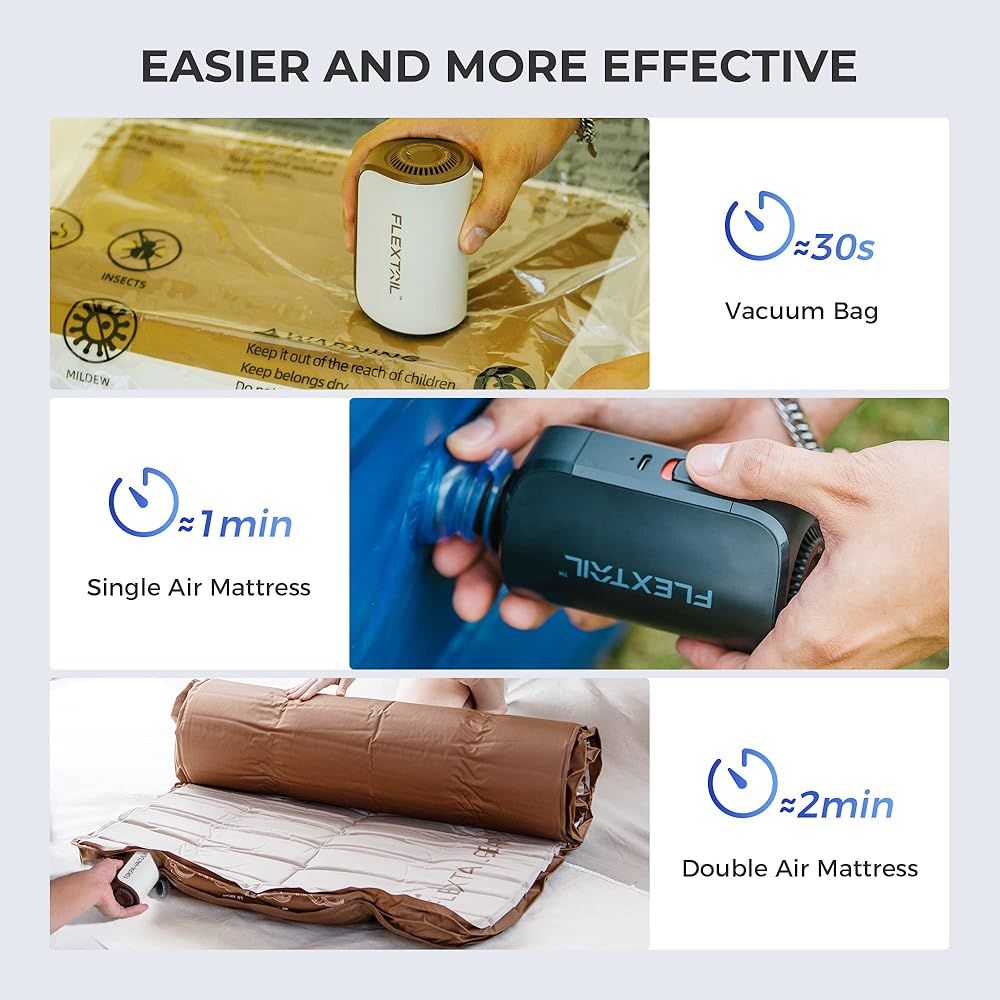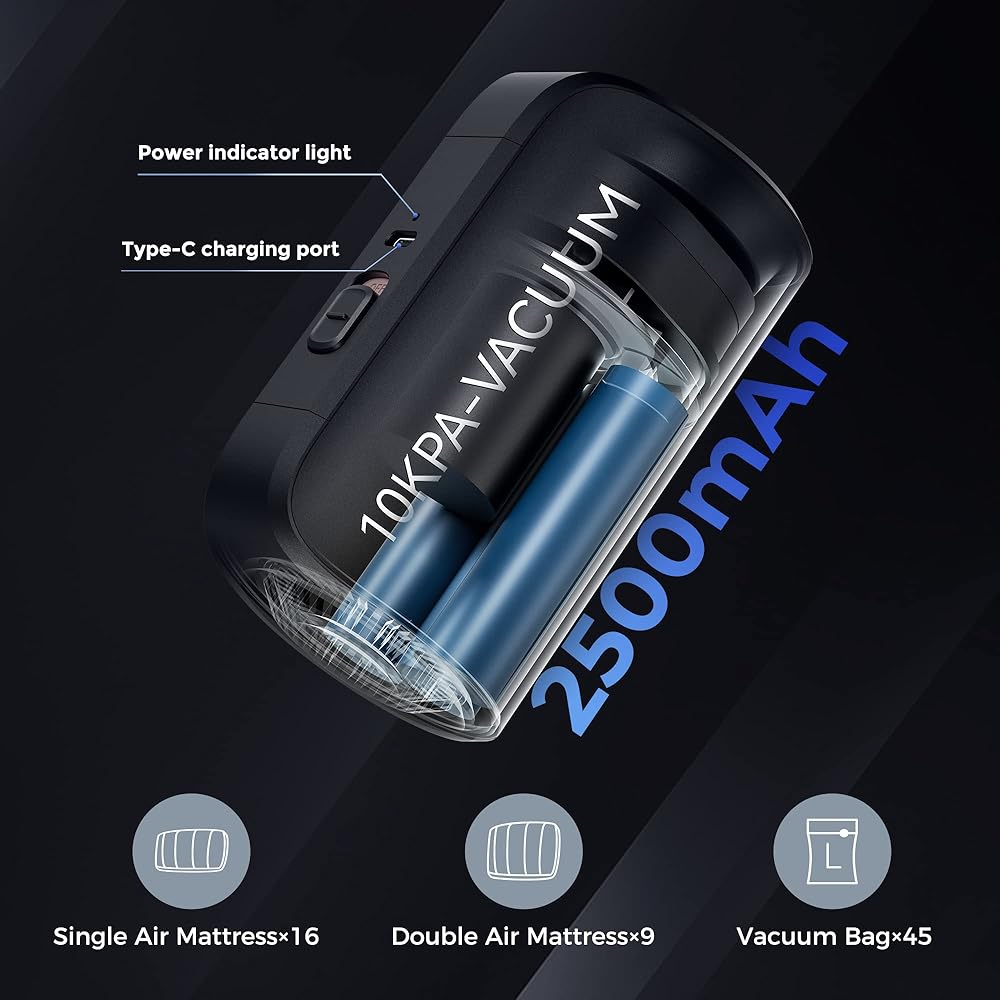 • 【High Flow Rates for Efficiency】It only takes 2½ minutes to inflate a double air mattress and half a minute for large vacuum bags. The compression ratio can reach up to 90%, saving space for your travel or family storage.