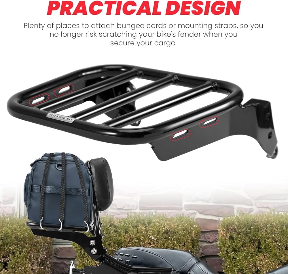 【هيكل عملي】 يوفر رف الأمتعة ذو مسند الظهر النحيف من سوفتيل الكثير من الأماكن لربط الحبال المطاطية أو أحزمة التثبيت، لذلك لم تعد تخاطر بخدش حاجز دراجتك عند تأمين حمولتك. رف الأمتعة الرياضي لمسند الظهر سيسي بار في وضع مستقيم مصمم بفتحات مقعرة فريدة لاستيعاب الأشرطة والخطافات، مما يسمح لك بتأمين حمولتك بشكل مريح وآمن باستخدام أحزمة ربط أو شبكة شحن أو حقيبة Solo Rack.