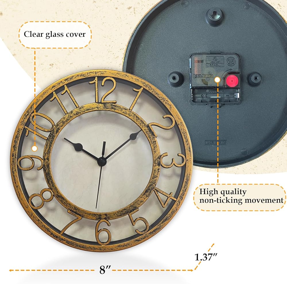 Smarten Arts 8 inch wall clock is a simple design clock suitable for any room decoration. Plastic frame have 2 kinds of color(gold, sliver) for your preference. Perfect size with only 8 inches. High-quality Quartz Sweep Movement guarantees accurate time and absolutely silent environment. Smarten Arts is you best choice.