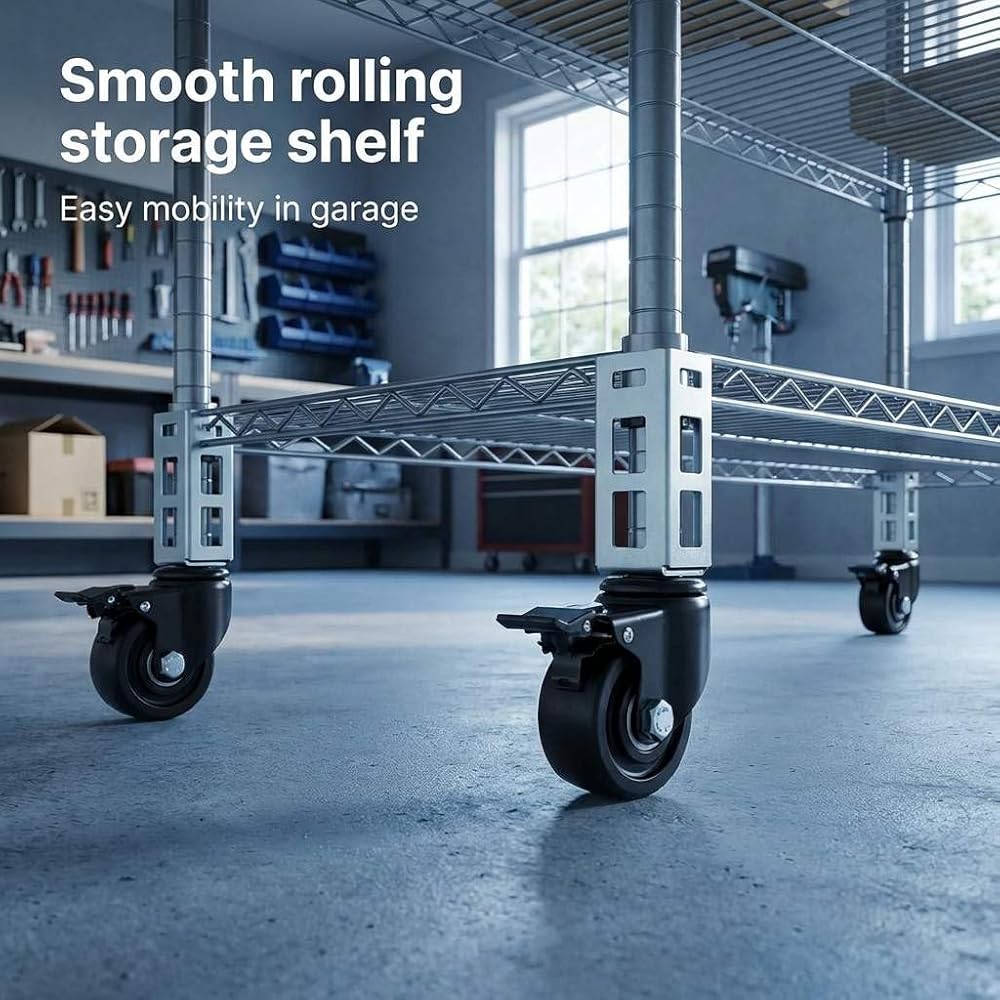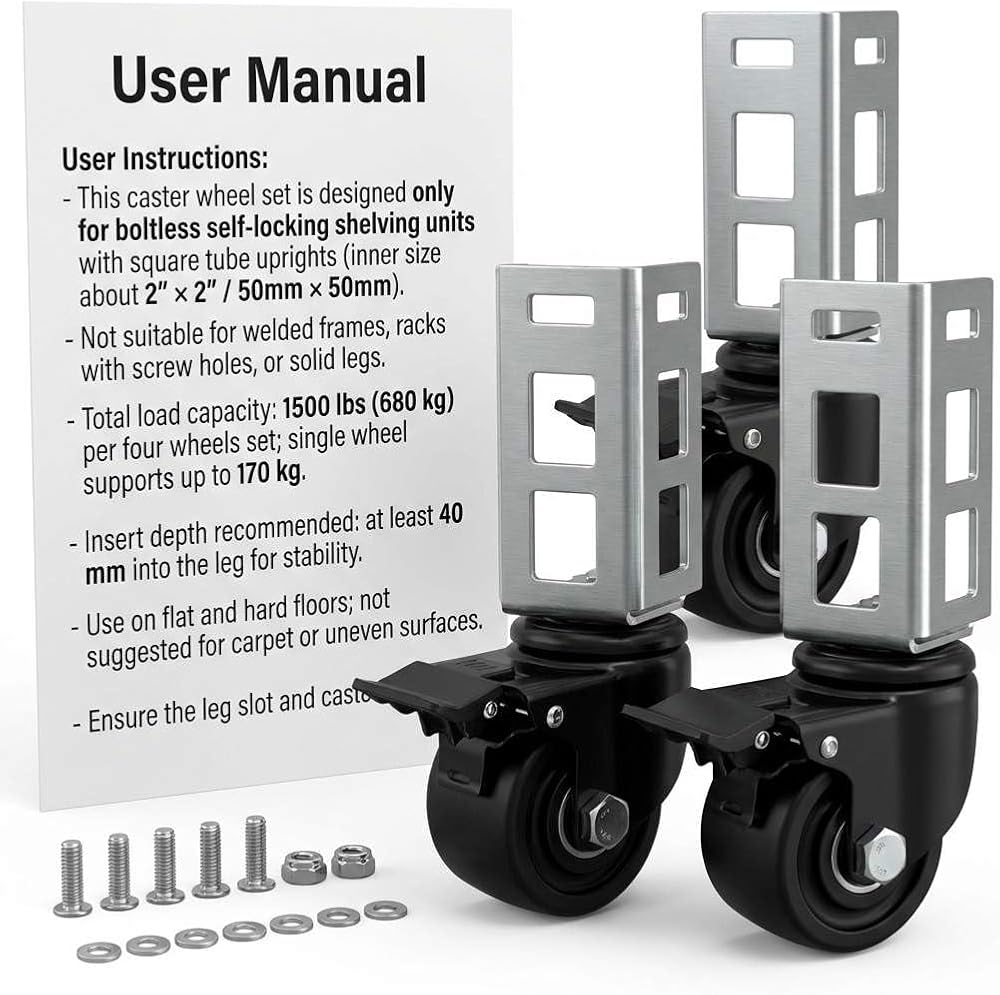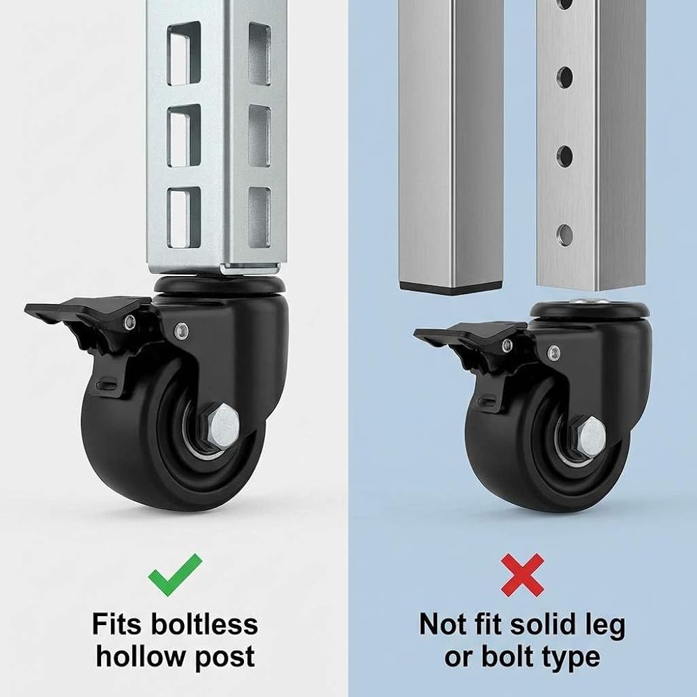 • عجلات الأمان: هذه العجلات مناسبة لرفوف التخزين مع نظام رفوف ذاتي القفل بدون مسامير، لسهولة الحركة والعرض الآمن.