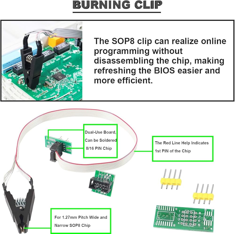 • 🎖️【CONVENIENT AND EFFICIENT】: The SOP8 clip can realize online programming without disassembling the chip, making refreshing the BIOS easier and more efficient.