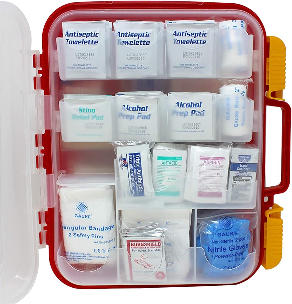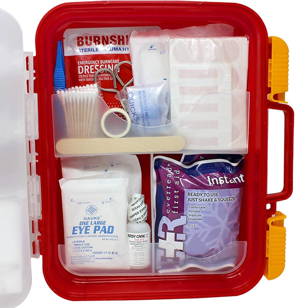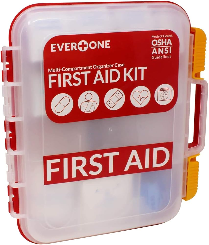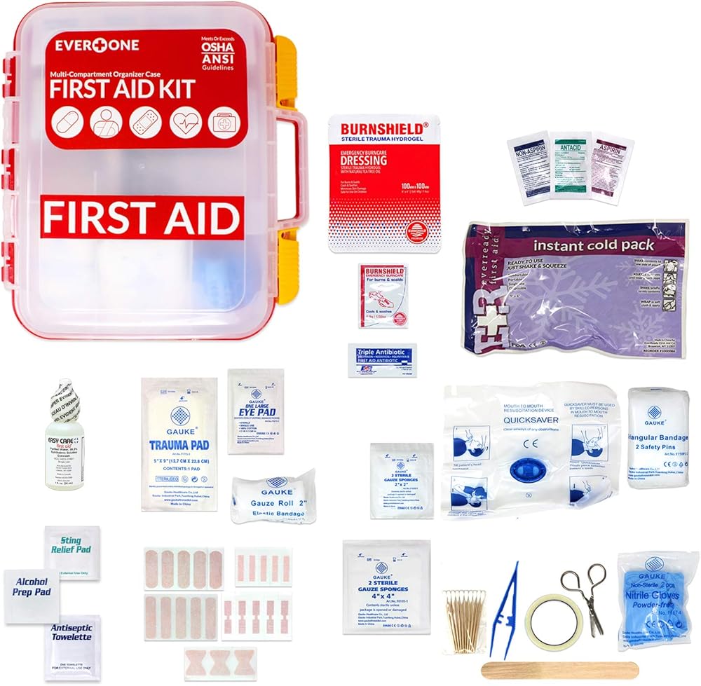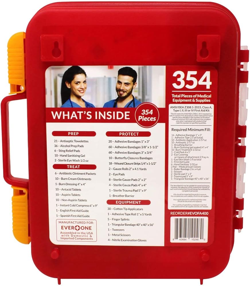 "EverOne 354 Piece Hard Case First Aid Kit PREP: 21 - Antiseptic Towelettes 36 - Alchol Prep Pads 6 - Sting Relief Pads 2 - Sterile Eye Wash 1/2 oz TREAT: 6 - Antibiotic Ointment Packets 10 - Burn Cream Ointments 1 - Burn Dressing 4"" X 4"" 10 - Antacid Tablets 10 - Asprin Tables 10 - Non-Asprin Tablets 1 - Instant Cold Compress 6"" X 9"" 1 - English First Aid Guide 1 - Spanish First Aid Quige PROTECT: 20 - Adhesive Bandages 1"" X 3"" 60 - Adhesive Bandages 3/8"" X 1-1/2"" 60 - Adhesive Bandages 3"" X 3/4"" 10 Butterfly Closures Bandages 18 - Wound Closure Strips 1/4"" X 1-1/2"" 2 - Gauze Rolls 2"" X 4.1 Yards 2 - Eye Pads 8 - Sterile Gauze Pads 2"" X 2"" 4 - Sterile Gauze Pads 4"" X 4"" 1 - Sterile Trauma Pad 5"" X 9"" 1 - Breather Barrier EQUIPMENT: 30 - Cotton Tip Applicators 1 - Adhesive Tape Roll 1"" X 5 Yards 5 - Finger Splints 1 - Triangular Bandage 40"" X 40"" X 56"" 1 - Tweezers 1 - Metal Scissors 4 - Nitrile Examination Gloves "