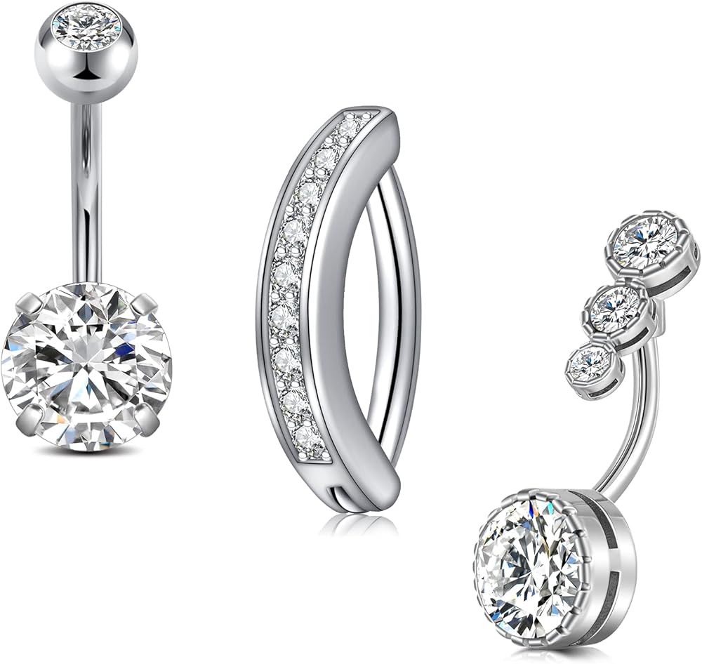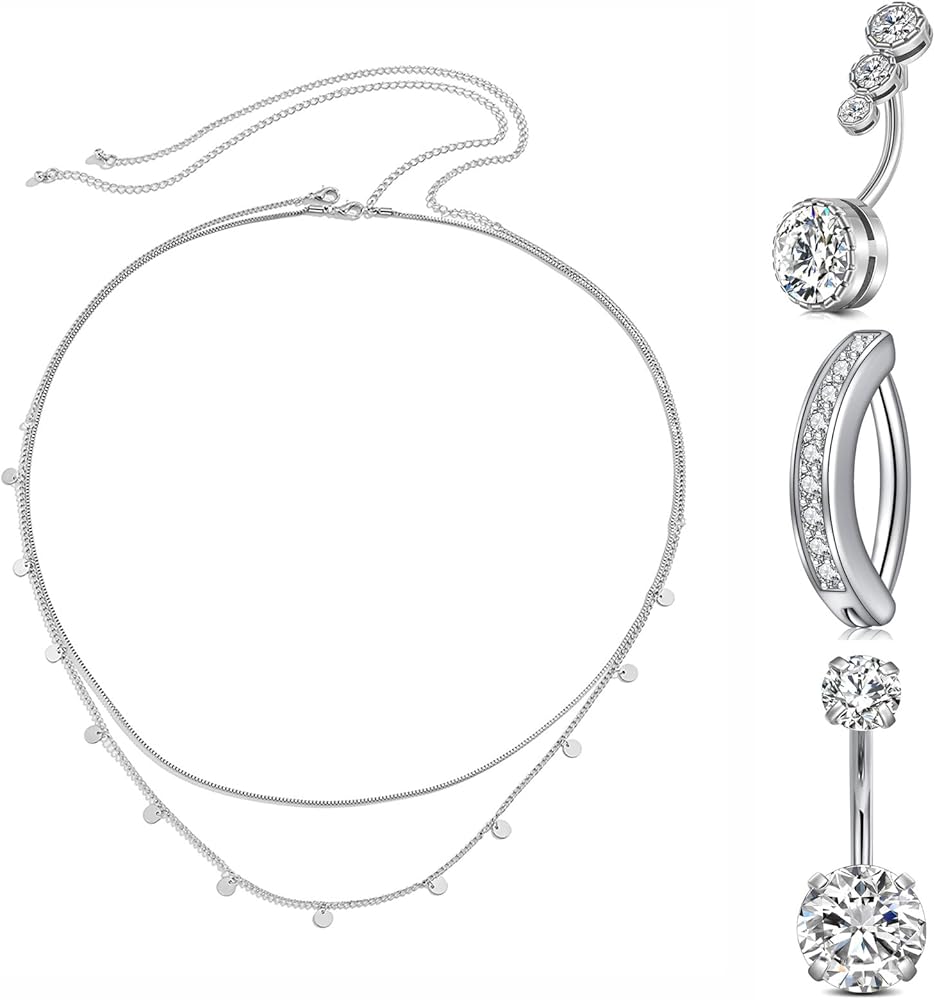 [Item Contain]: 1pcs clicker belly button ring + 2pcs classic belly button rings + 1pcs silver belly chain silver waist chain silver body chain jewelry