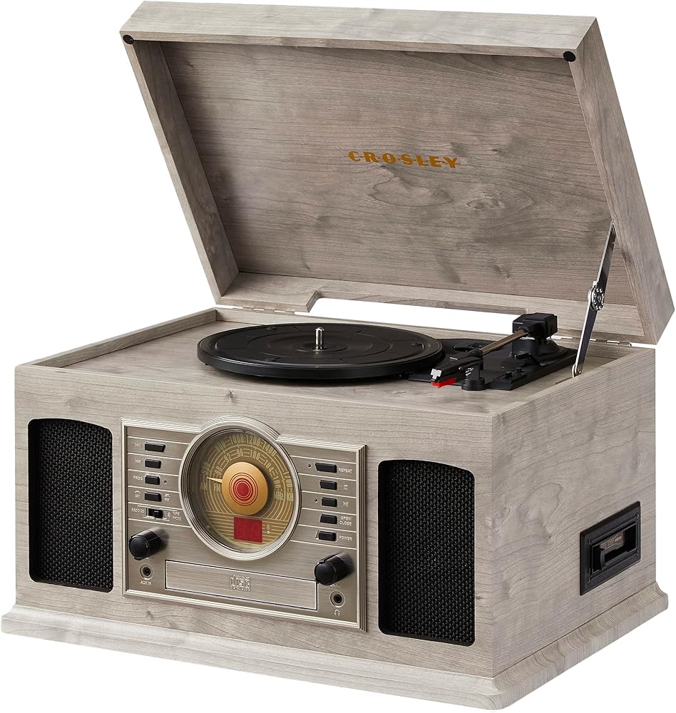 With a classically cool retro look, the Burton Entertainment Center brings the beauty of the past into the 21st century with modern functionality and sound. The sleek walnut cabinet and gunmetal accents echo the dashboard design of a classic car, while its 5-in-1 functionality situates the Burton firmly in the present. The ability to play your entire music collection is right at your fingertips – the choice of records, CDs, cassettes, or Bluetooth streaming is up to you. If the retro appearance inspires you to spin the dial and tune in to AM/FM radio, you've got that option, too. No matter your musical mood, the Burton is ready to take you there.
