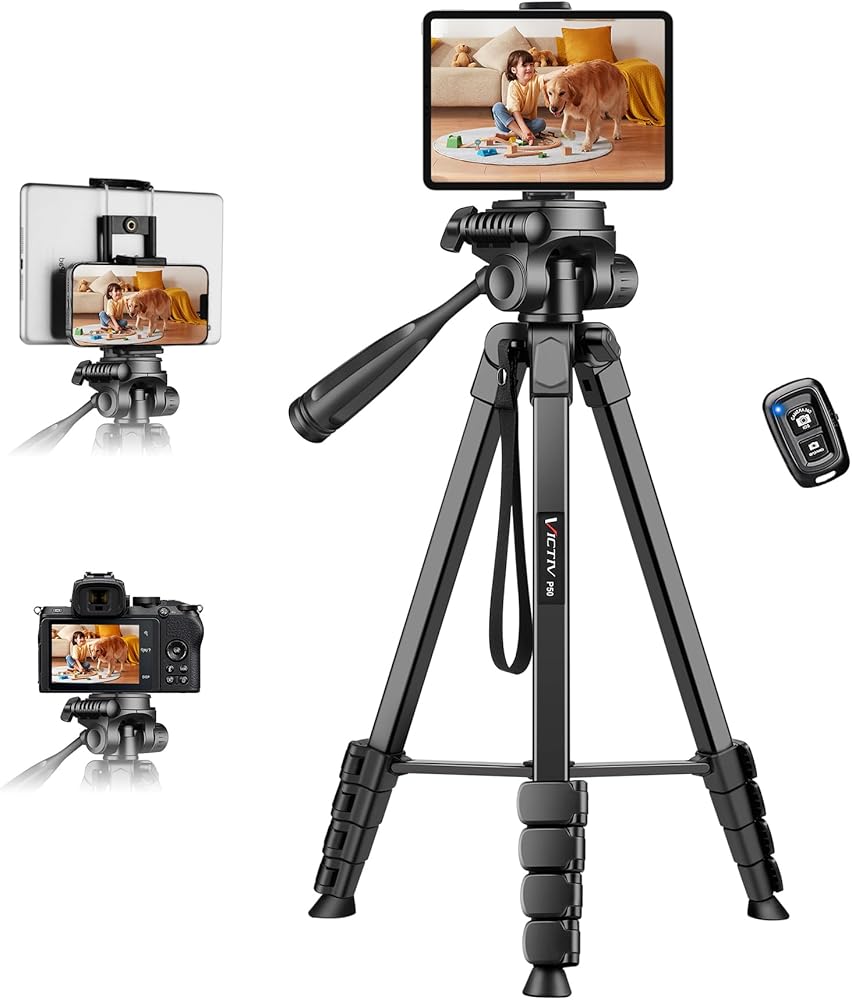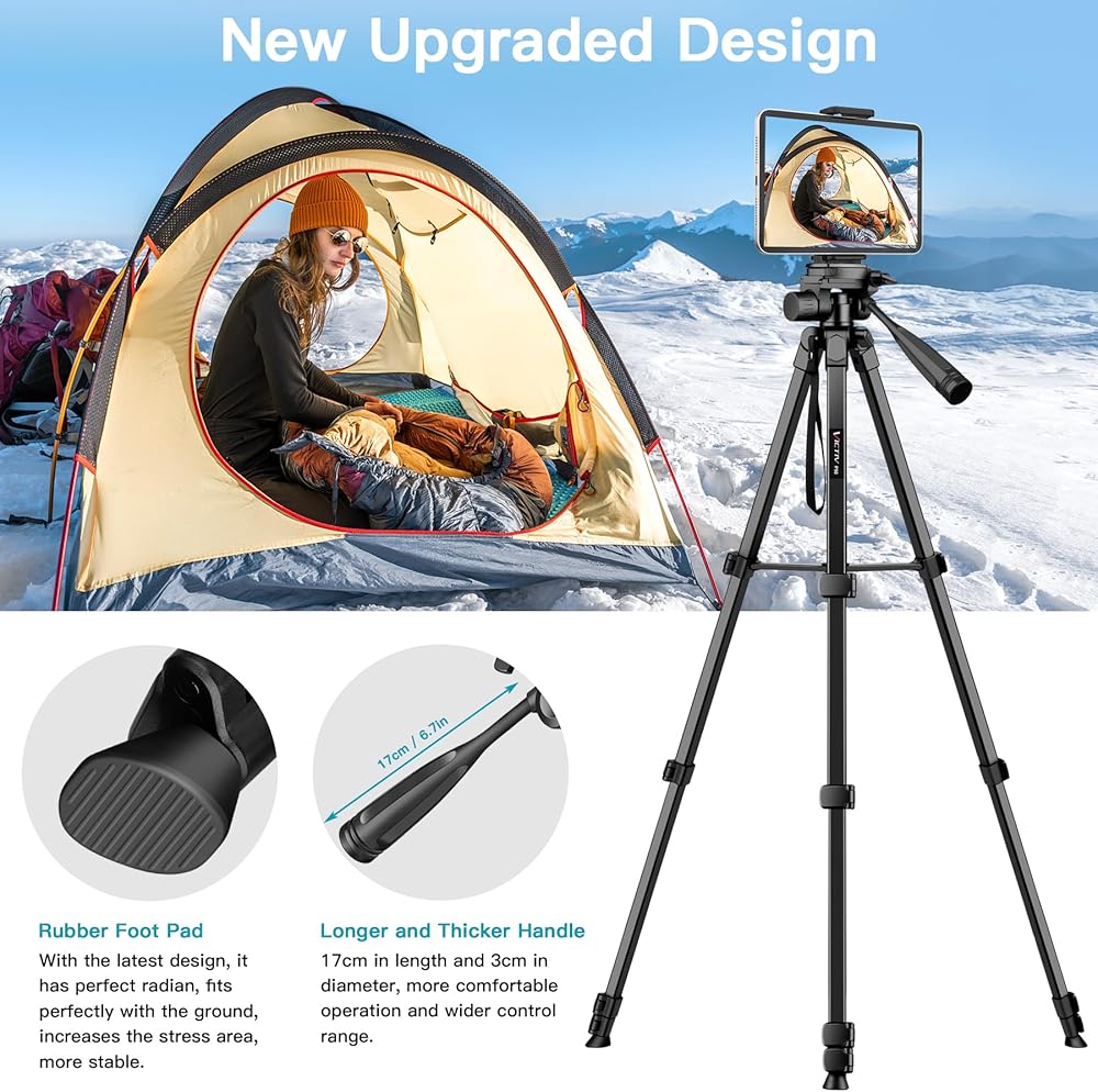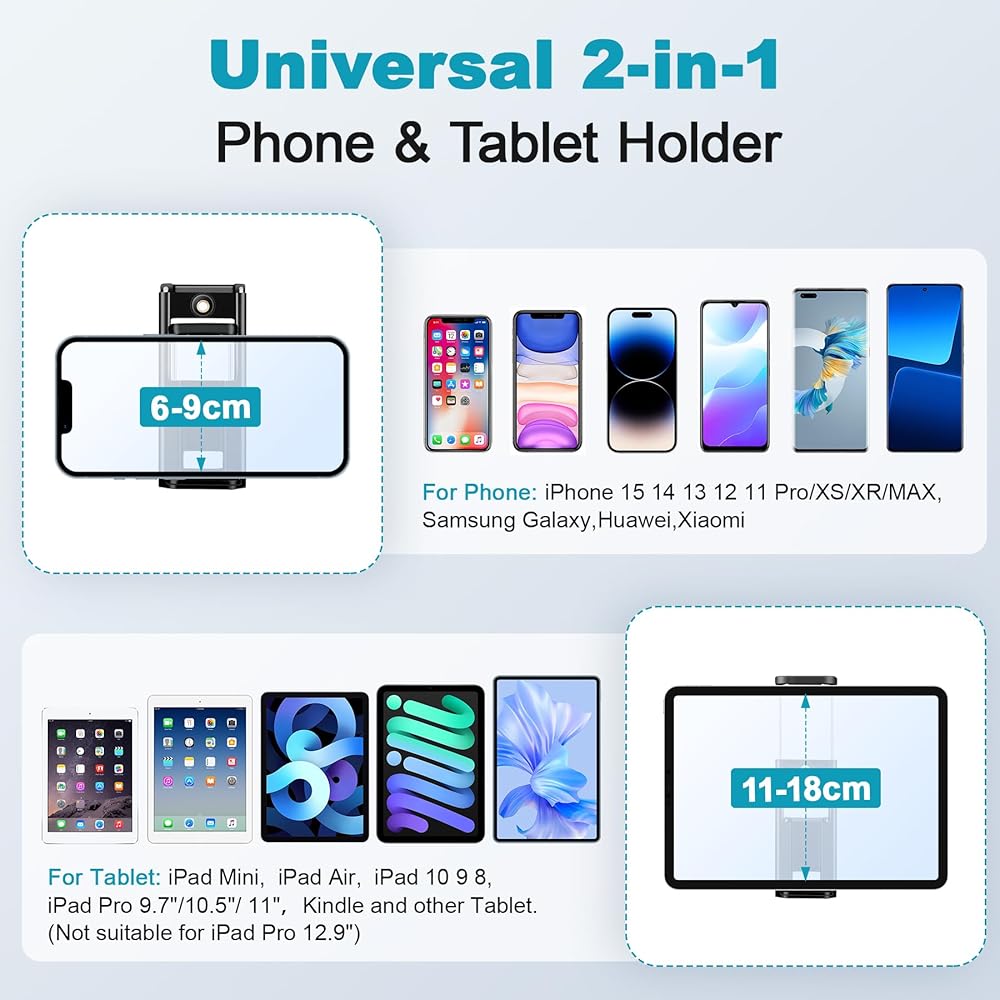 【 Phone Tripod with Universal 2-in-1 Tablet Holder】VICTIV phone and tablet tripod comes with a 2-in-1 clip, can carry both cell phone (landscape/vertical) and tablet. Compatible with iPad, iPad Air, iPad Pro 10.2"/10.9"/11"/12.9", iPad mini, and many other tablets. For smartphones like iPhone15 14 13 12 11 Pro/XS/XR, Samsung, Xiaomi, Huawei, etc.