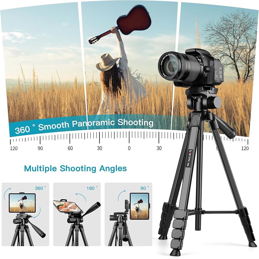 【Multi-functional Tripod Kit & 3-Way Pan Head】Versatile camera tripod comes with Standard 1/4" screw mount, performs well with a wide range of devices, compatible with small cameras/DSLR/Gopro/webcams/ring light. Stable and smooth 3-way pan head can freely adjustable angles for 360° panoramic shooting, 180°up & down shooting, and 90°vertical portrait , which can satisfy all the needs of vertical, horizontal, and overhead photography, etc.
