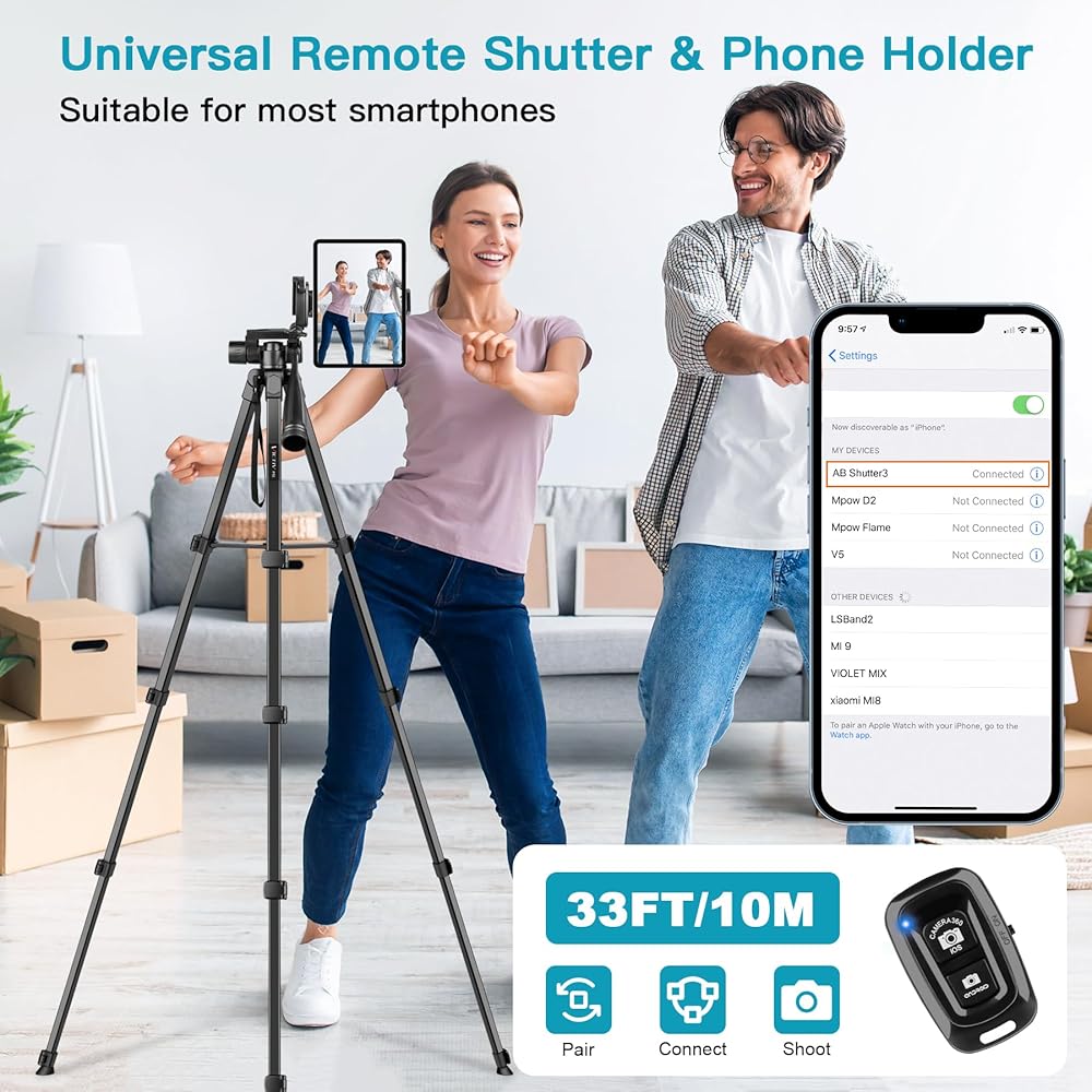 【Wireless Remote Shutter】Phone tripod stand is equipped with a wireless remote, easily connect your phone (iOS and Android), tablet, camera.It allows you to conveniently capture photos and videos from a distance of up to 33ft/10m. No need to touch, you can easily realize photo shooting, video shooting.