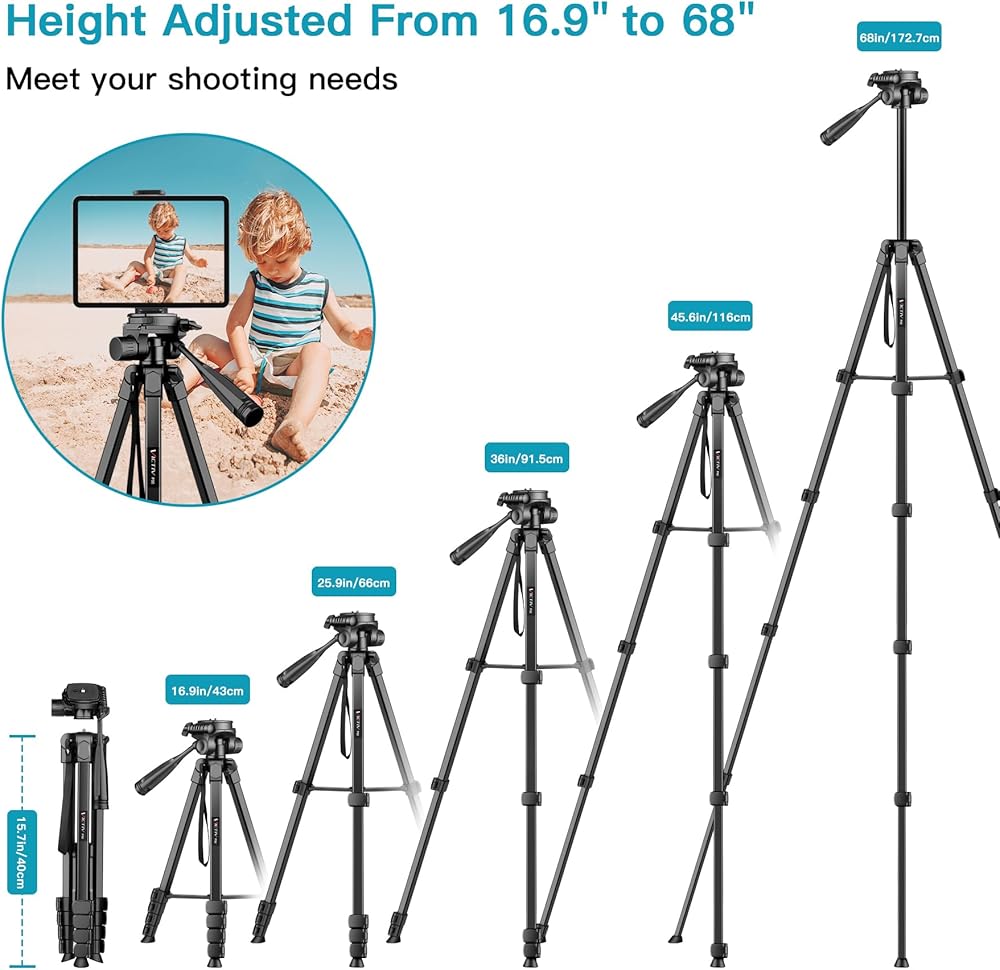 【Stable Tripod Adjustable Height】Tripod stand easily extends the tripod height (from 16.9 inches to 68 inches) by adjusting the quick-release leg locks, perfect for various photography heights. Non-slip rubber feet provides strong stability, withstand up to 9.3 pounds of pressure. It provides reliable support for various photography needs, selfies, camera photography, live streaming, vlogging, pursuing fitness activities or practicing dance.