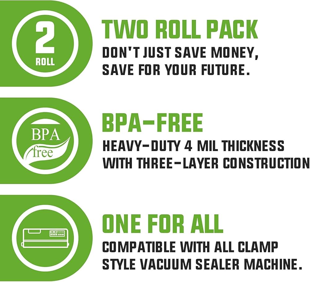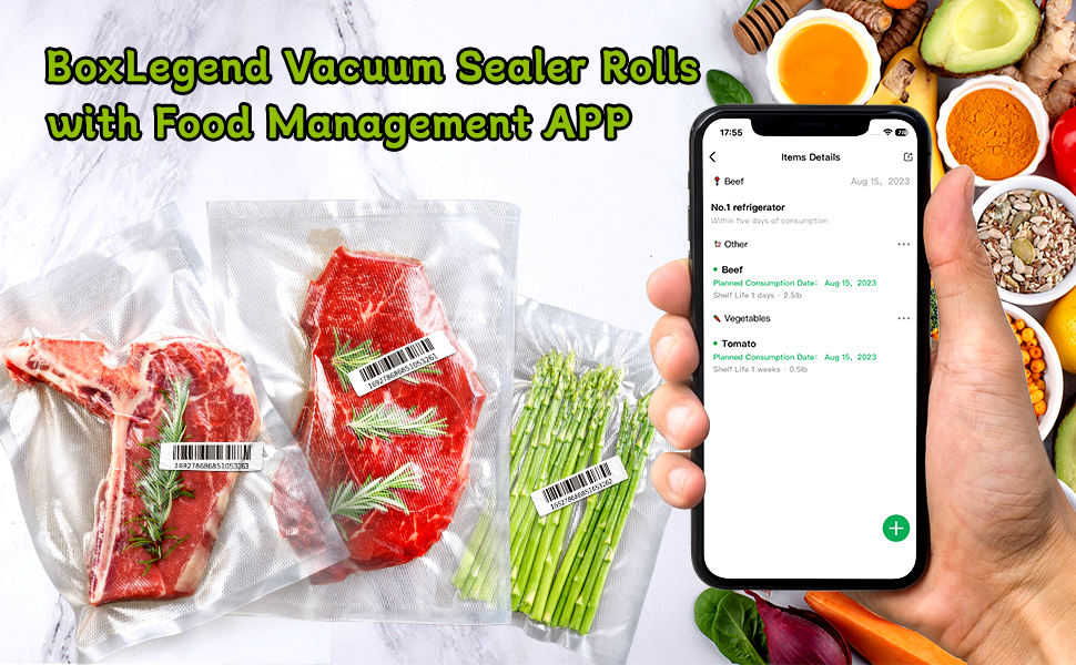 أكياس تفريغ الهواء من بوكس ليجيند مع تطبيق إدارة الطعام مقاس 11 بوصة × 50 بوصة (عبوة من قطعتين)، أكياس حفظ الطعام مع رموز شريطية لتتبع الطعام، أكياس تفريغ مفرغة خالية من البيسفينول A لفيديو Sous Vide، وتخزين الطعام، وإعداد الوجبات