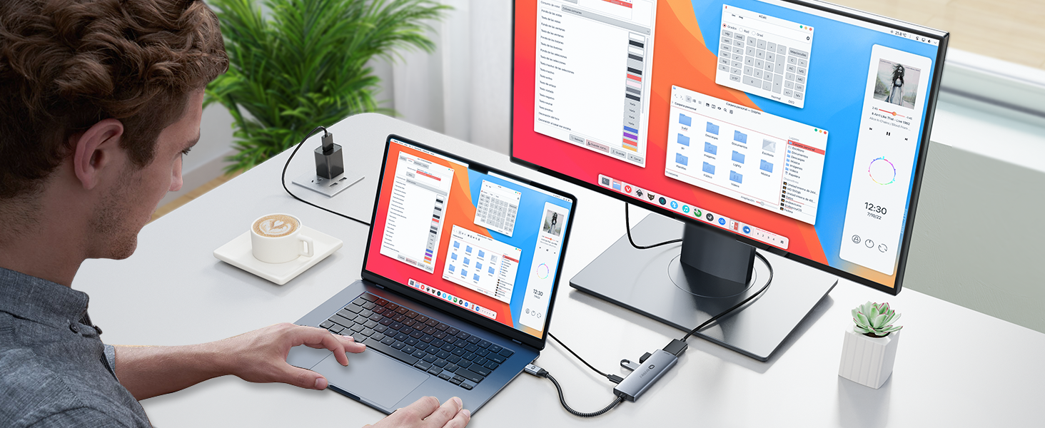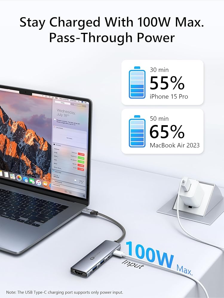 【ثلاثة منافذ USB 3.0 وواحد PD100W】استمتع باتصال عالي السرعة بسرعة 5 جيجابت في الثانية مع ثلاثة منافذ USB 3.0 (بما في ذلك 2 USB-A و1 USB-C). قم بتوصيل الأجهزة الطرفية USB-A الموجودة لديك، مثل الماوس ولوحة المفاتيح، من خلال منفذي USB-A. يتيح منفذ USB-C المخصص اتصالاً سلسًا مع الأجهزة الطرفية USB-C الأحدث ويسهل نقل البيانات بسهولة مع هاتفك أو محرك الأقراص الثابتة باستخدام كابل USB-C. بالإضافة إلى ذلك، يضمن منفذ USB-C PD شحنًا يصل إلى 100 واط للحفاظ على بقاء الكمبيوتر المحمول الخاص بك قيد التشغيل.