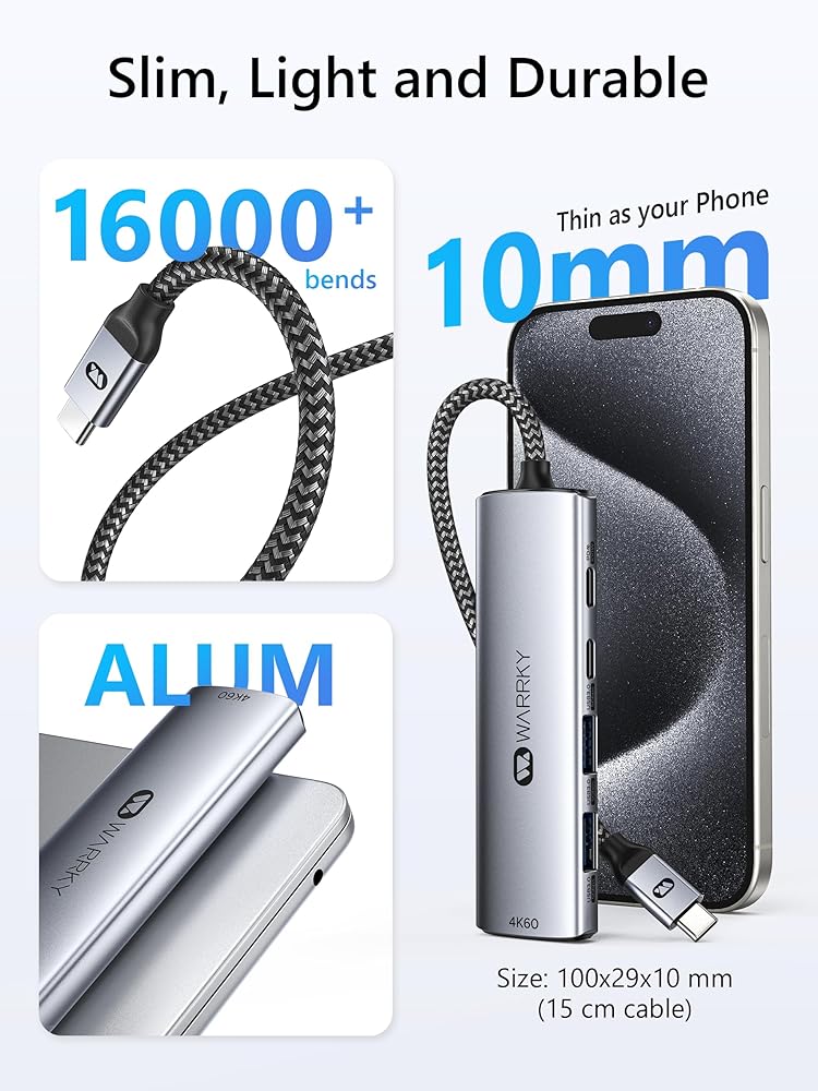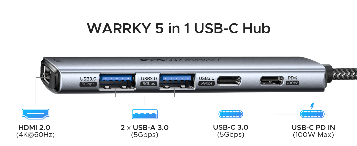 WARRKY USB C Hub 5 في 1 【4K 60 هرتز HDMI】 منافذ A&C من النوع 5 جيجابت في الثانية، PD 100 وات، محطة إرساء متينة من الألومنيوم والنايلون، محول USBC متعدد المنافذ متوافق مع MacBook Pro/Air، iPad Pro، iPhone 15، أجهزة الكمبيوتر المحمولة