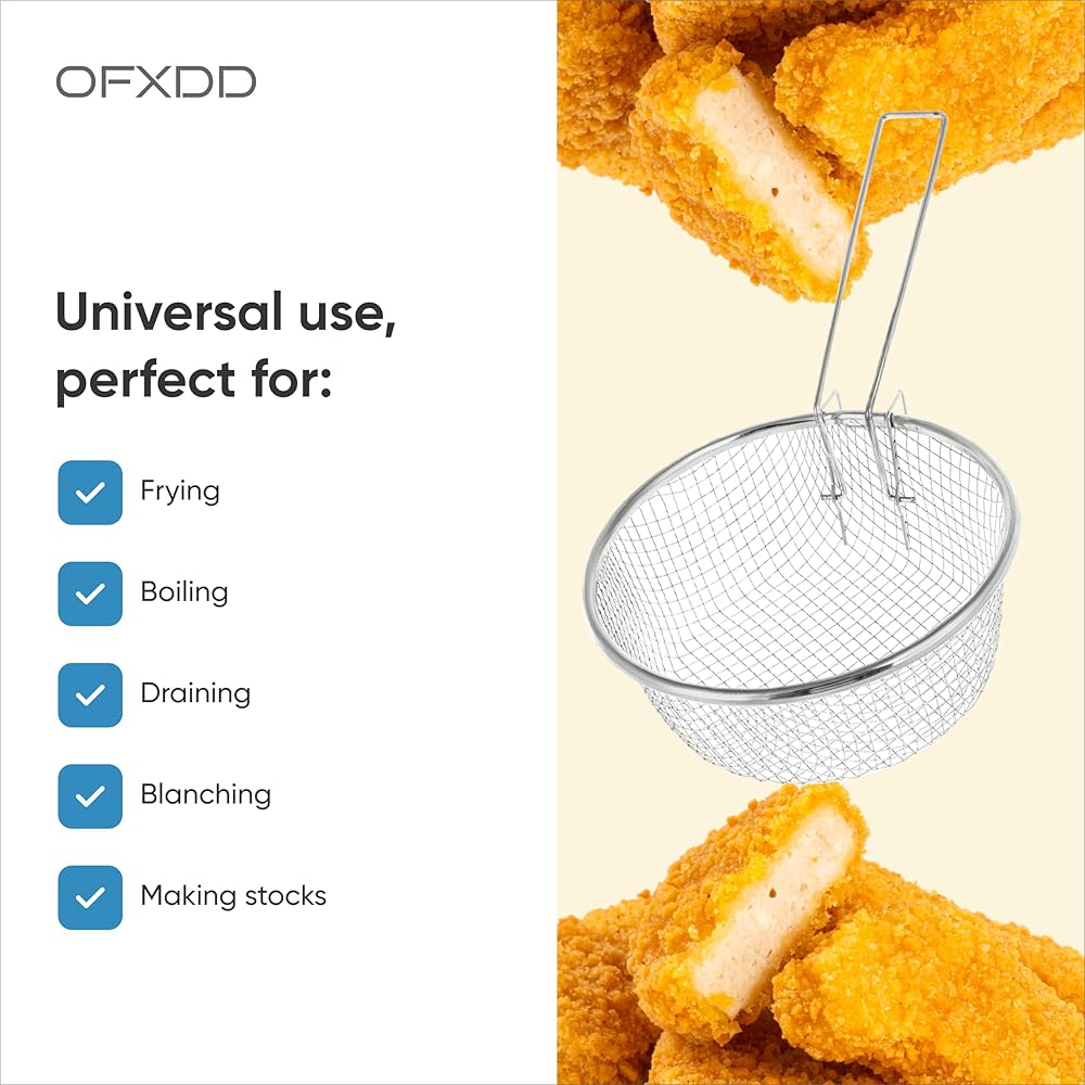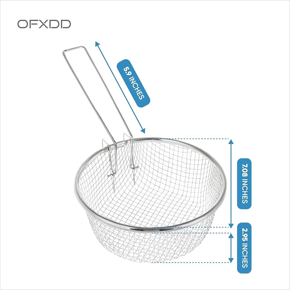 The round mesh basket is easy to clean. The deep fry basket strainer is durable and useful. The fry basket stainless is perfect for diy the french fries, potato chips,onion rings,fried chicken.