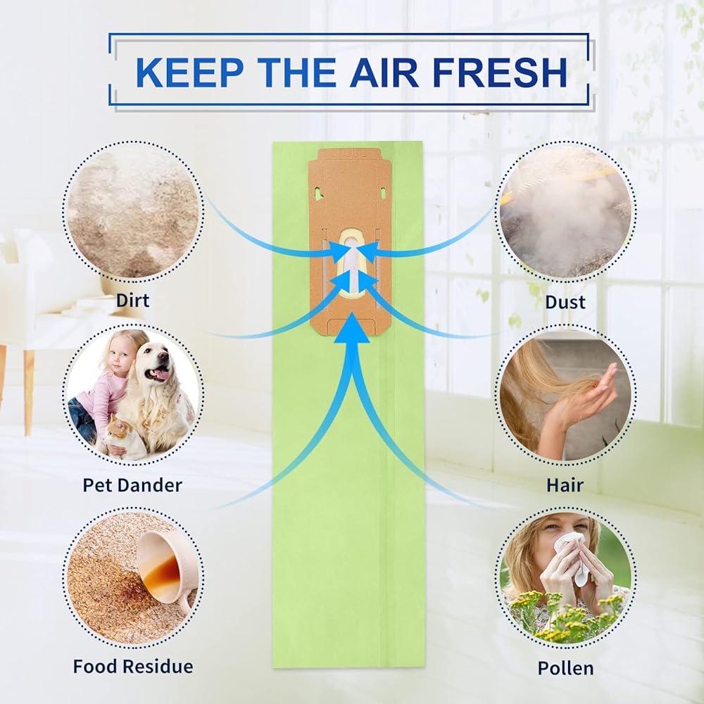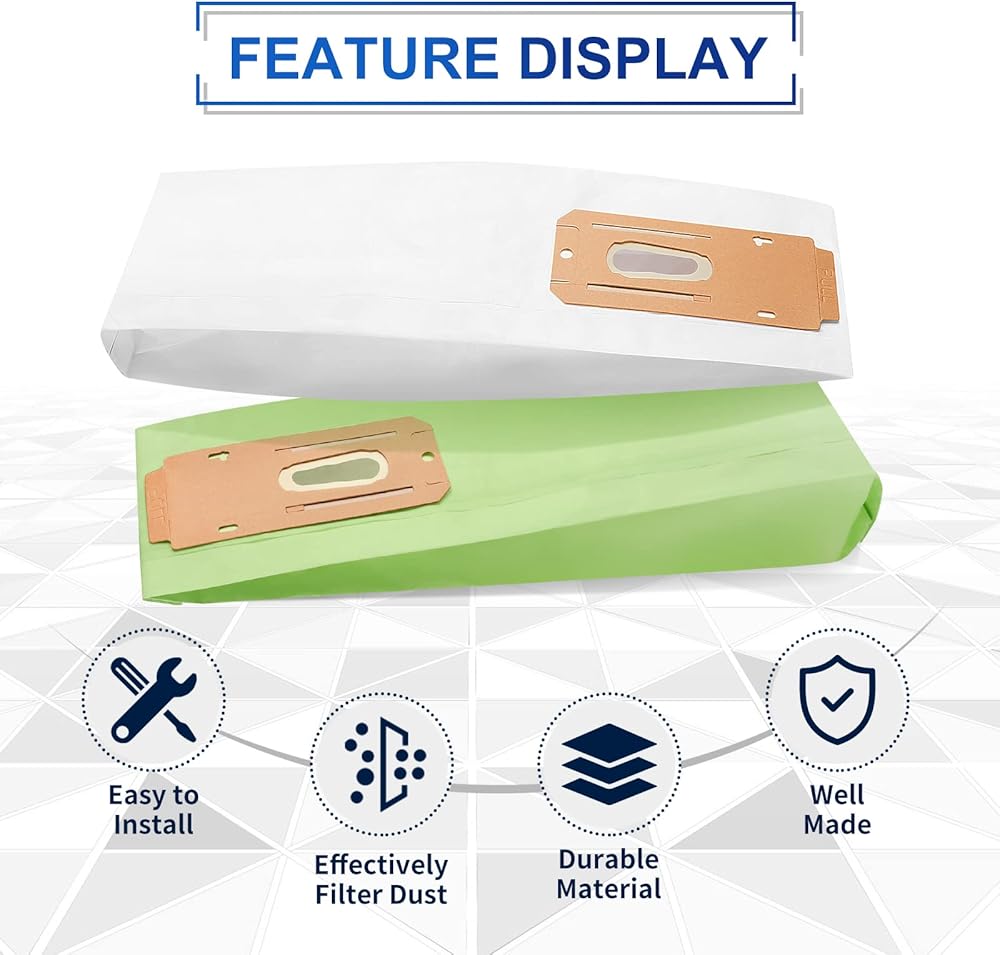 سعة كبيرة جدًا: يمكن لأكياس المكنسة الكهربائية استيعاب ما يصل إلى 4 أضعاف وبر الحيوانات الأليفة وجزيئات الأوساخ والحطام أكثر من المكنسة الكهربائية العادية بدون كيس. هذه الحقائب سهلة التركيب والإزالة للاستخدام التجاري أو المنزلي.