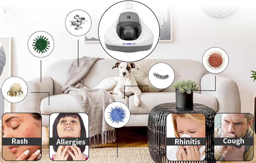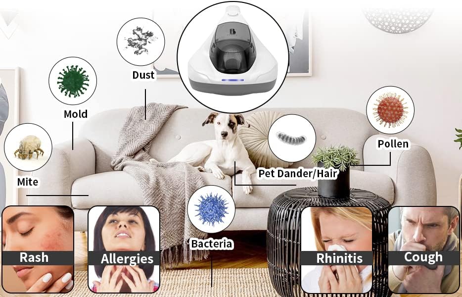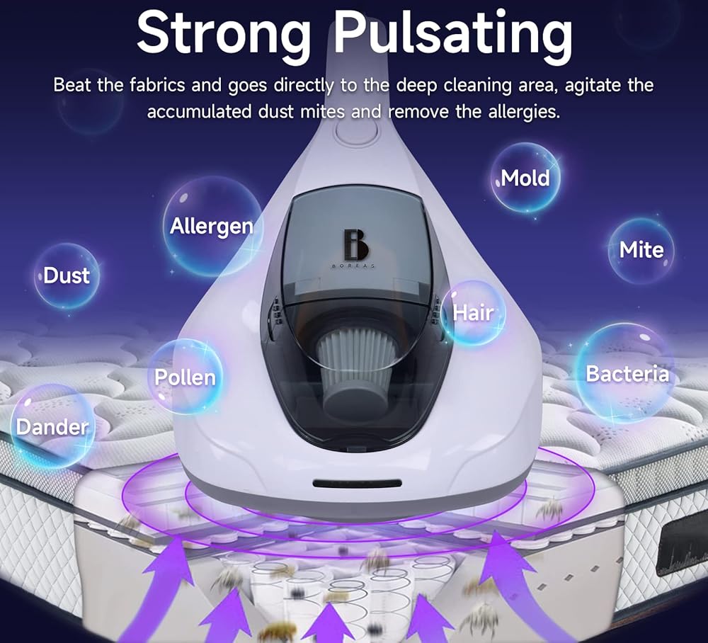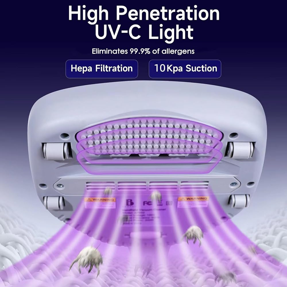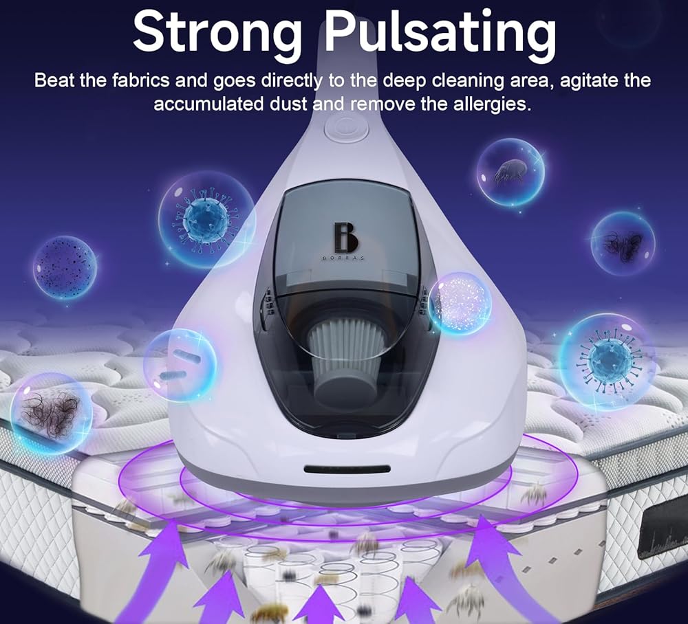 【تعقيم فعال】يمكن للمكنسة الكهربائية لسرير بورياس المزودة بالأشعة فوق البنفسجية عالية الاختراق أن تقضي بشكل فعال على 99.9% من المواد المسببة للحساسية والبكتيريا والعث. إن مصباح الكوارتز UV ذو الكاثود الحراري المصنوع خصيصًا هو قوي جدًا وله عمر خدمة أطول.
