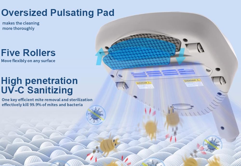 【وسادة نابضة كبيرة الحجم】تهتز الوسادة النابضة الكبيرة بتردد عالٍ للتغلب على الأقمشة وإثارة عث الغبار المتراكم، مما يجعل التنظيف أكثر شمولاً.