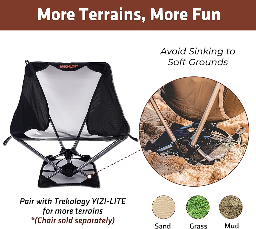 No More Sinking Chairs: Prevent your chair from sinking into soft grounds such as muddy grass or sand. This anti-sinking mat is lightweight and pairs well with portable camping chairs. Now you can bring your camping chairs to more terrains…worry-Free! Why not add this to your Trekology Yizi Go Portable Camping Chair Order Today?