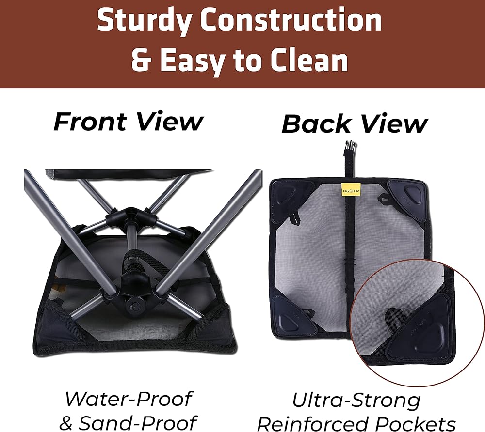 Durable: The leg pockets are made of the highest quality polyester to ensure strength and endurance. Added loops and clasps ensure a secure attachment between the chair and ground sheet. All corners are double stitched to ensure proper fit and sturdiness. No detail is overlooked in designing this strong and durable ground sheet!
