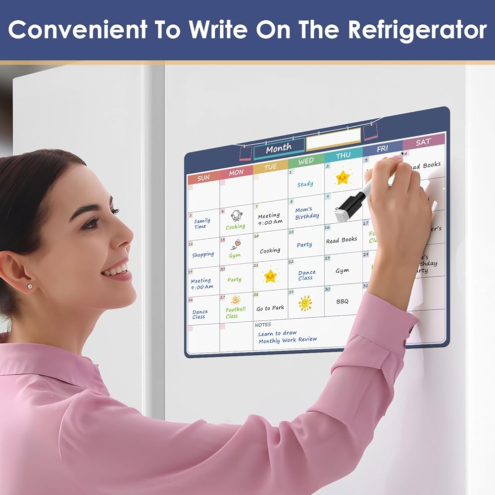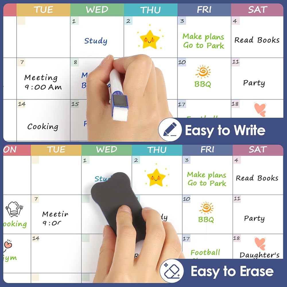 • لوحة تقويم قابلة لإعادة الاستخدام وسهلة التنظيف: تتيح لك الأسطح الناعمة القابلة للمسح الجاف مسح الملاحظات القديمة وكتابة الملاحظات في ثوانٍ. استخدم الممحاة للتنظيف وأقلام التحديد لكتابة تذكيرات وقوائم جديدة.