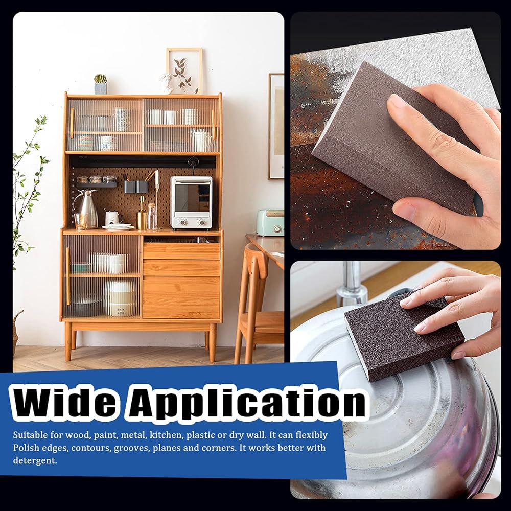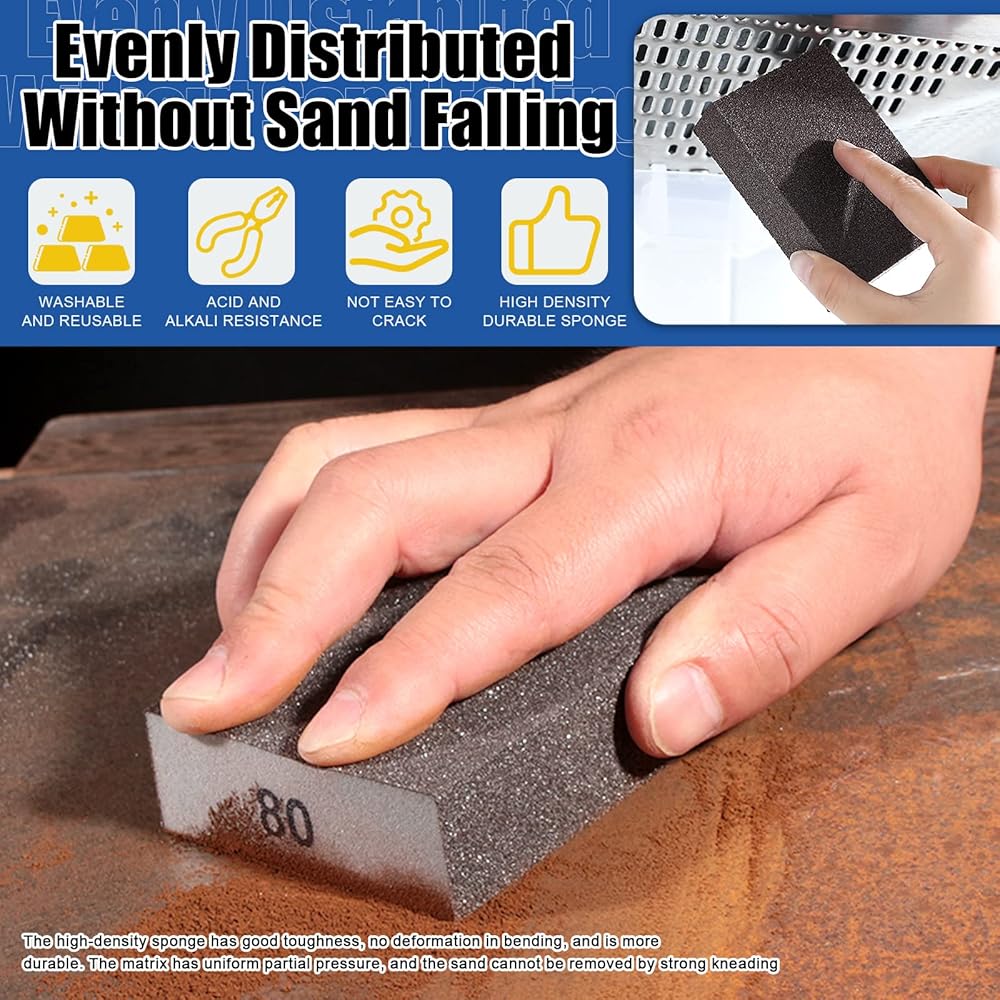√ Made of high-quality brown corundum and high density sponges, no sand loss and resistant to water, wear, acid and alkali. √ These sanding sponge pads are washable and reusable, which can reduce flushing time and improve work efficiency greatly.