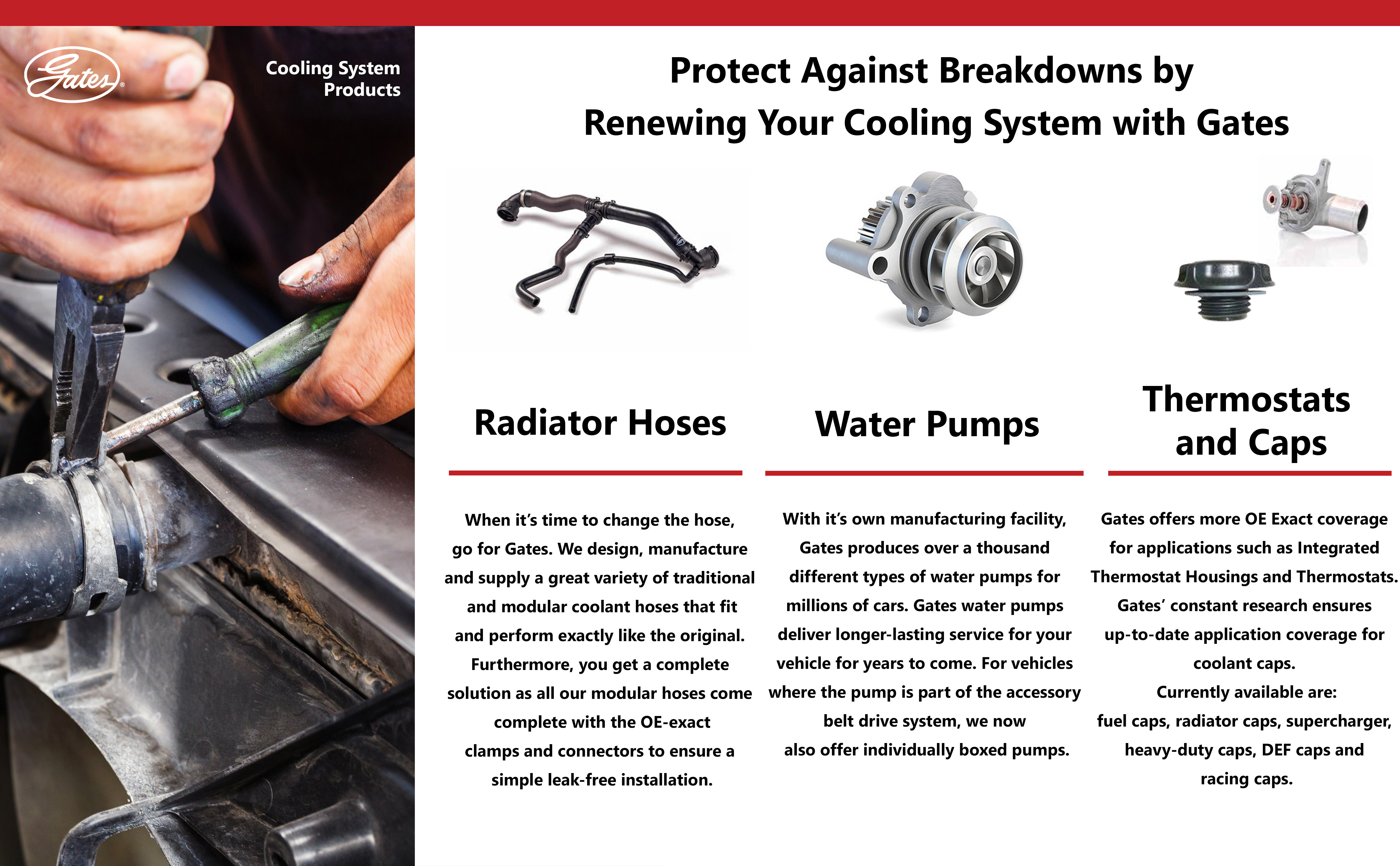 Gates is the Automotive Aftermarket leader in the unique modular assembly coolant hose segment. Gates Modular Coolant Hose is manufactured to fit specific applications and are similar to OEM specifications to include specific essential integrated OE components such as hose branches, quick-connectors, sensors, restrictors, etc.