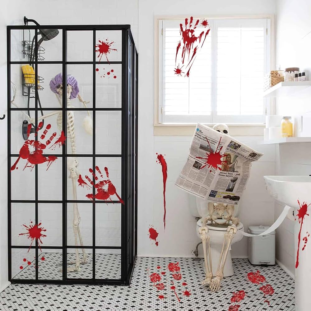 [Halloween Decorations Stickers] The bathroom butcher scene props, red footprints and handprints bring a realistic appearance make it more halloween. Halloween decoration has a strong sense, attracting everyone's attention.