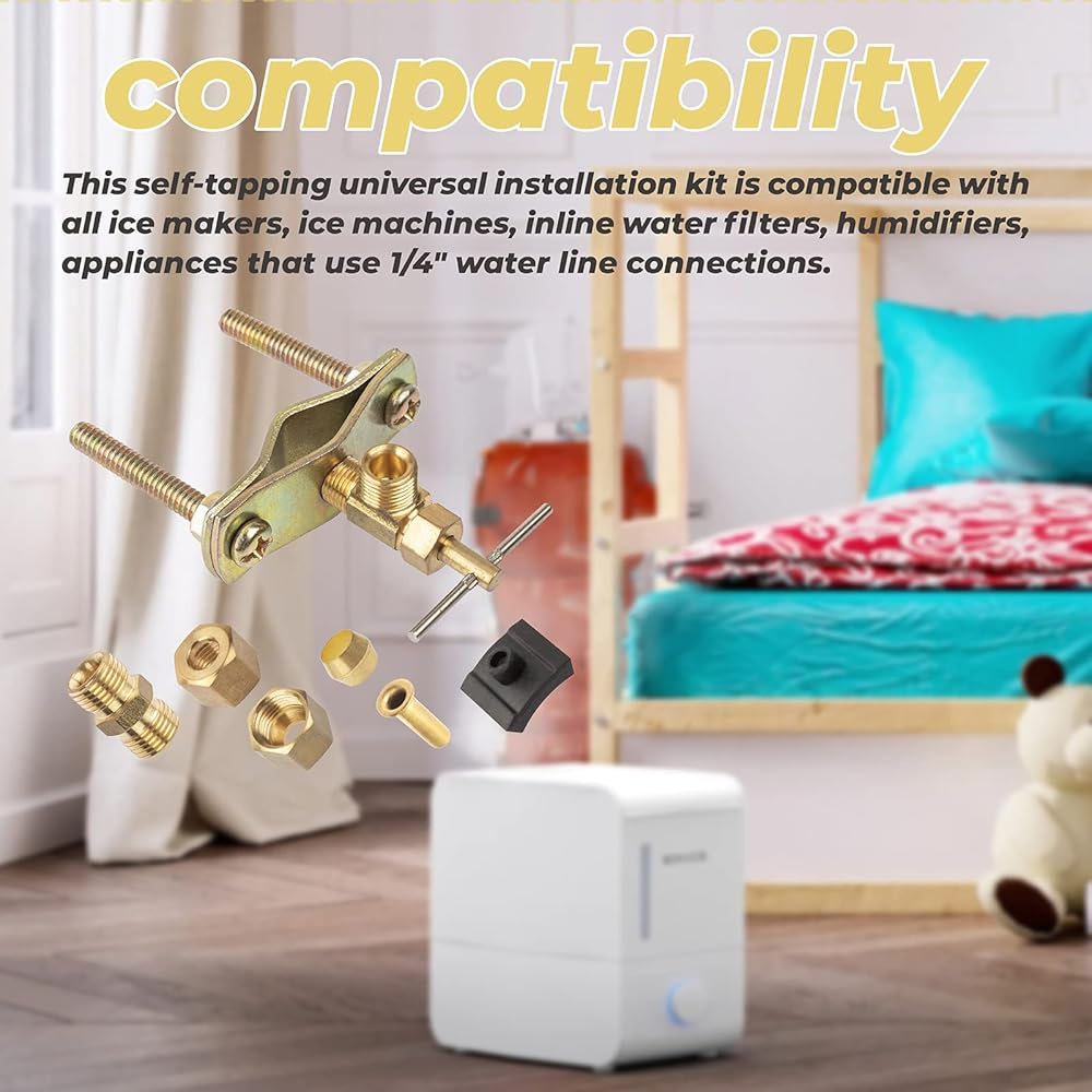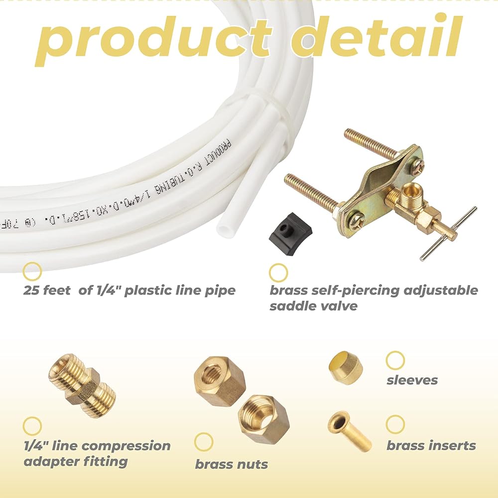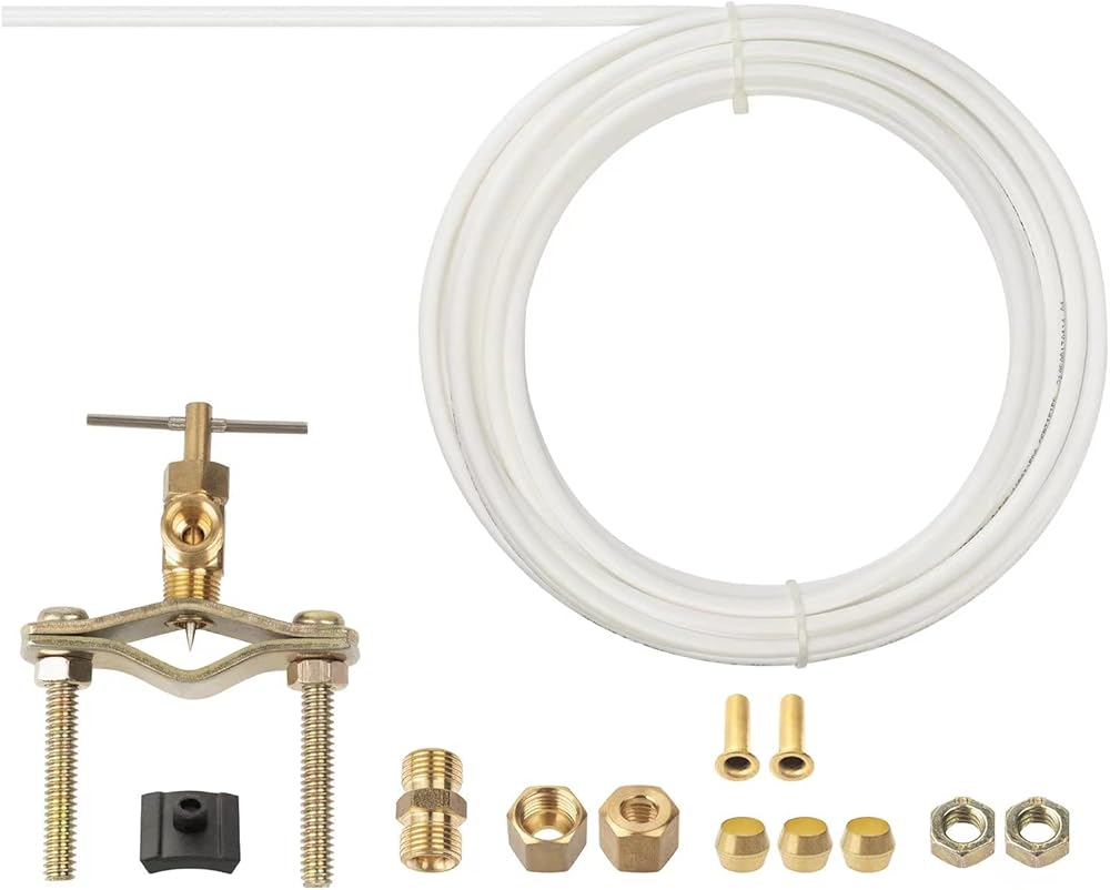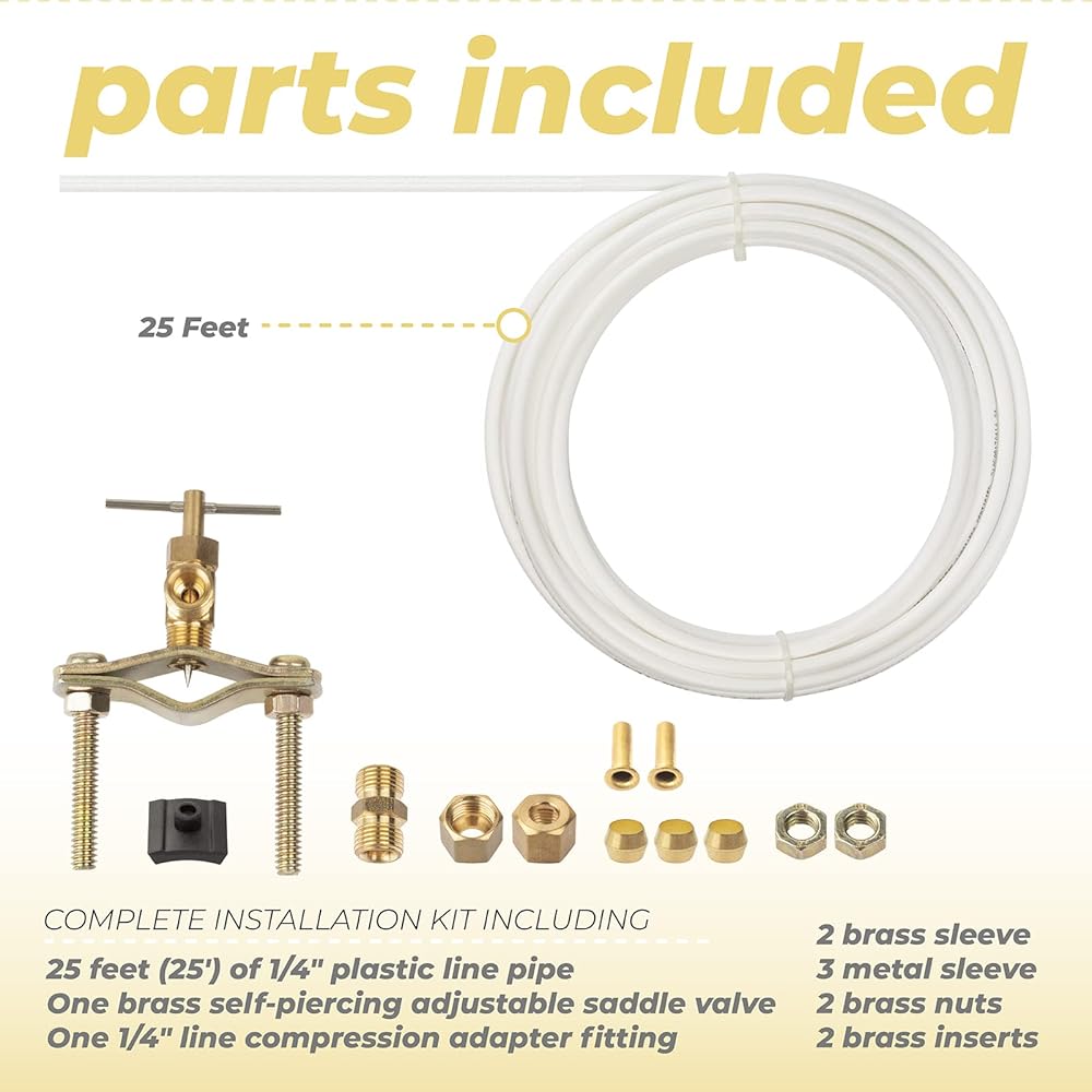 المحتويات: مجموعة تركيب كاملة تتضمن أنبوب بلاستيكي بطول 25 قدم (25 قدم) مقاس 1/4 انش، وصمام سرج نحاسي قابل للتعديل ذاتي الثقب، محول ضغط خط 1/4 انش، 2 كم نحاسي، 2 كم بلاستيكي، 2 صواميل نحاسية، 2 حشوات بلاستيكية، 3 مجموعات خطوط مياه للثلاجة. غلاف بلاستيكي، صامولة ضغط وحشوة نحاسية (لأنابيب البولي إيثيلين المعززة).