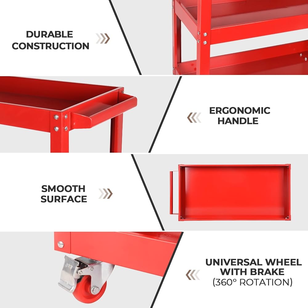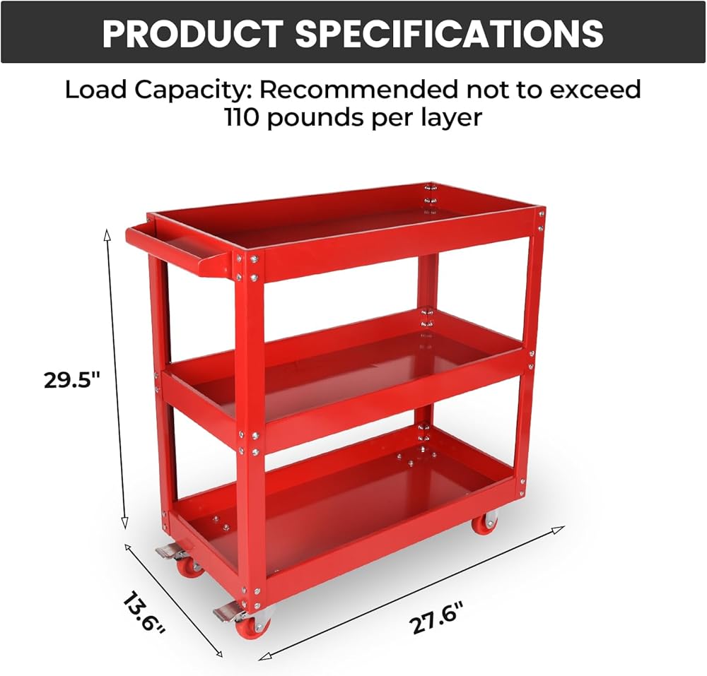 عربة أدوات ذات 3 طبقات، عربة أدوات دوارة مع عجلات فرامل، عربة خدمة مواد فولاذية شديدة التحمل، سعة تحميل 110 رطل لكل طبقة، لتخزين المستودعات والمكاتب والمرآب، أحمر