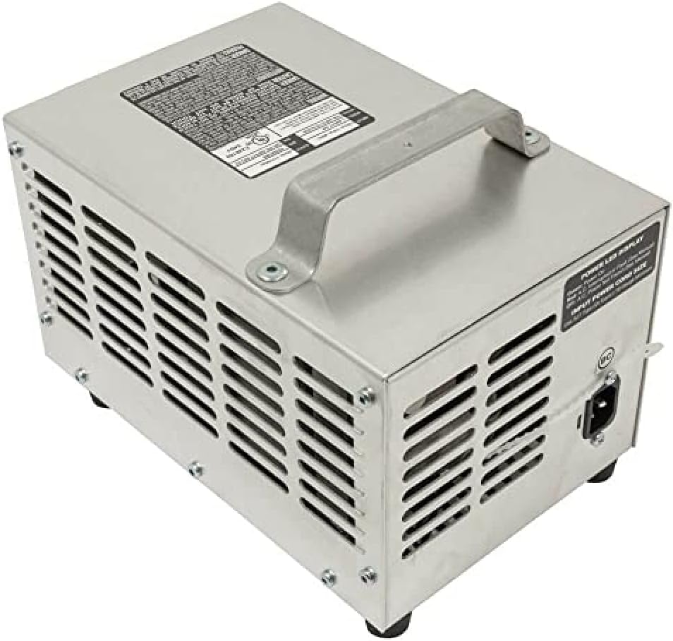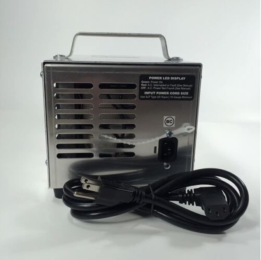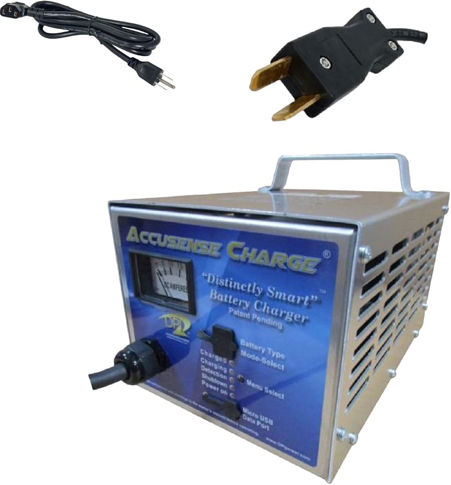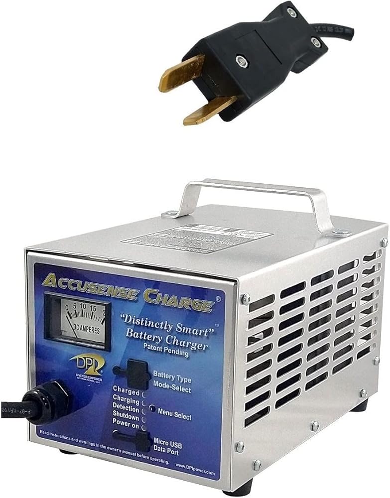 Specifications: Large Analog meter with 5-L.E.D Display No Spark Charging, Reverse Battery Protection Accusense-Charge Series High-Reliability Economy Series (Generation IV model) Multi Stage Charging Algorithm Pre-Qualification Test Stage tests the condition of the battery and prepares battery with a specialized Test Charge Algorithm to prepare battery pack for fast charge. Up to 18 A Output Fast charge to quickly replenish 80% capacity Cell-Balancing. The Equalization Stage balances battery cells and increases charged capacity to near 100% DPI's computational algorithm computes the precise amount of Top-Off Charge which brings the battery to 100% state of charge. Automatic A.C. Disconnection / Reconnection after charger has finished charging conserves energy while continuing to monitor and trickle charge battery pack Periodical Auto-Restart, when batteries are left in storage, assures battery pack is ready to go at the start of the season. Patent Pending Selector allows user to charge most every lead-acid battery type 32 Charge modes available via user accessible switch. Large and Small Capacity Battery Flooded, AGM, Sealed Multi-Chemistry UL/CSA Listed CEC Compliant Designed/Made In USA 30lbs (13.5kg), 6.25x6.875x10.25in (159x175x260mm)