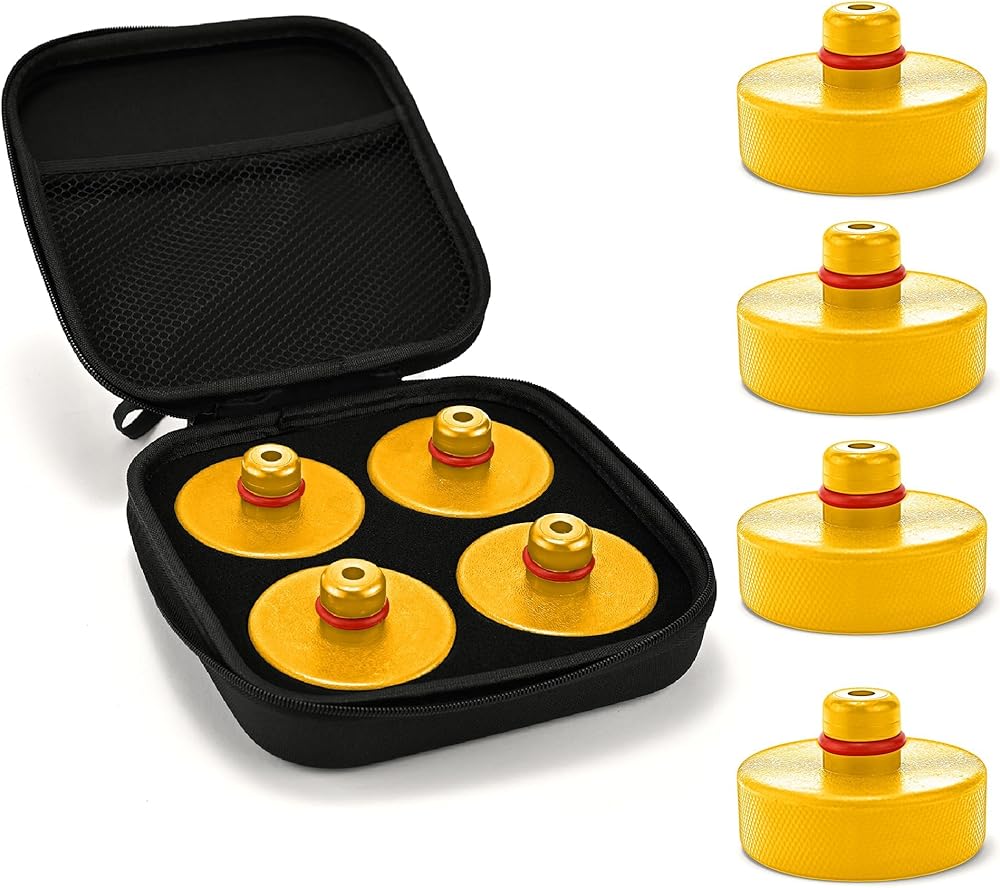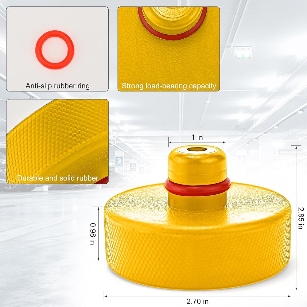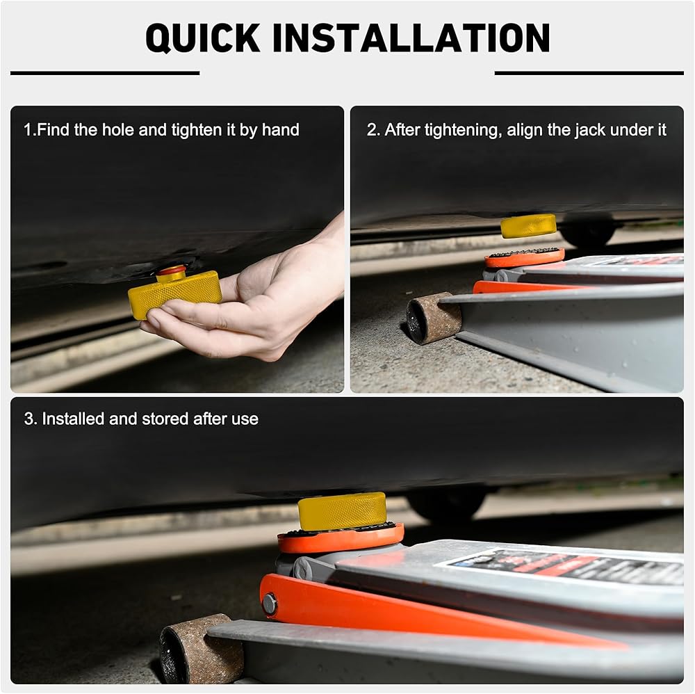🚗【يتضمن صندوق تخزين】: تحتوي هذه العبوة على 4 وسادات جاك مع صندوق تخزين متين وجميل وأدوات إطارات كاملة وزوج من قفازات العمل لحماية وسادات الرافعة من التلف بمرور الوقت. يرجى ملاحظة أنه بسبب المادة المطاطية شديدة التحمل المستخدمة في إنتاج وسادات الرافعة، قد تكون هناك رائحة مطاطية طفيفة. نوصي بتهويتها في غرفة جيدة التهوية لفترة من الوقت.