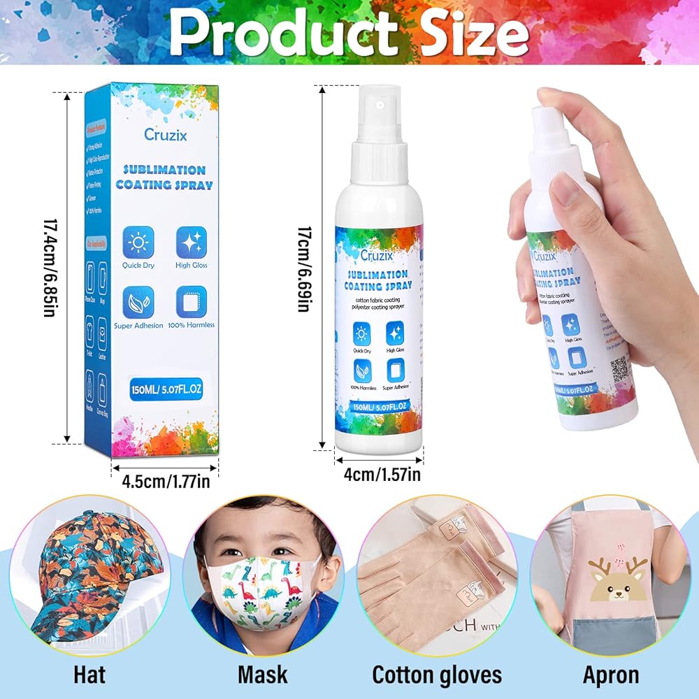 👕【Fast Drying and Strong Adhesion】Cruzix poly t plus sublimation spray for cotton dries quickly after spraying to create a smooth surface without causing any damage to fabrics and other sublimation objects. Moreover, the coating can greatly enhance the adhesion between ink and surfaces of sublimation objects, making the sublimated pattern brighter and more vivid. When used with a heat press or other heat transfer machine, it will provide excellent results.