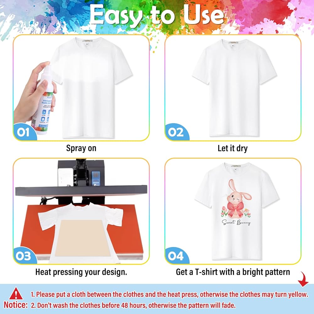 👕【Larger Capacity & One-step Process】The sublimation spray for dark cotton shirts has a net content of 150ml, which is more adequate for your daily needs than those 100ml sprays commonly available on the market. And it is equipped with humanized spray head for easy applying. What's more, the sublimation tshirt spray uses an all-in-one formula that allows it to be sprayed directly on the fabric without mixing it with other liquids. You could start your heat pressing when the coating dries.