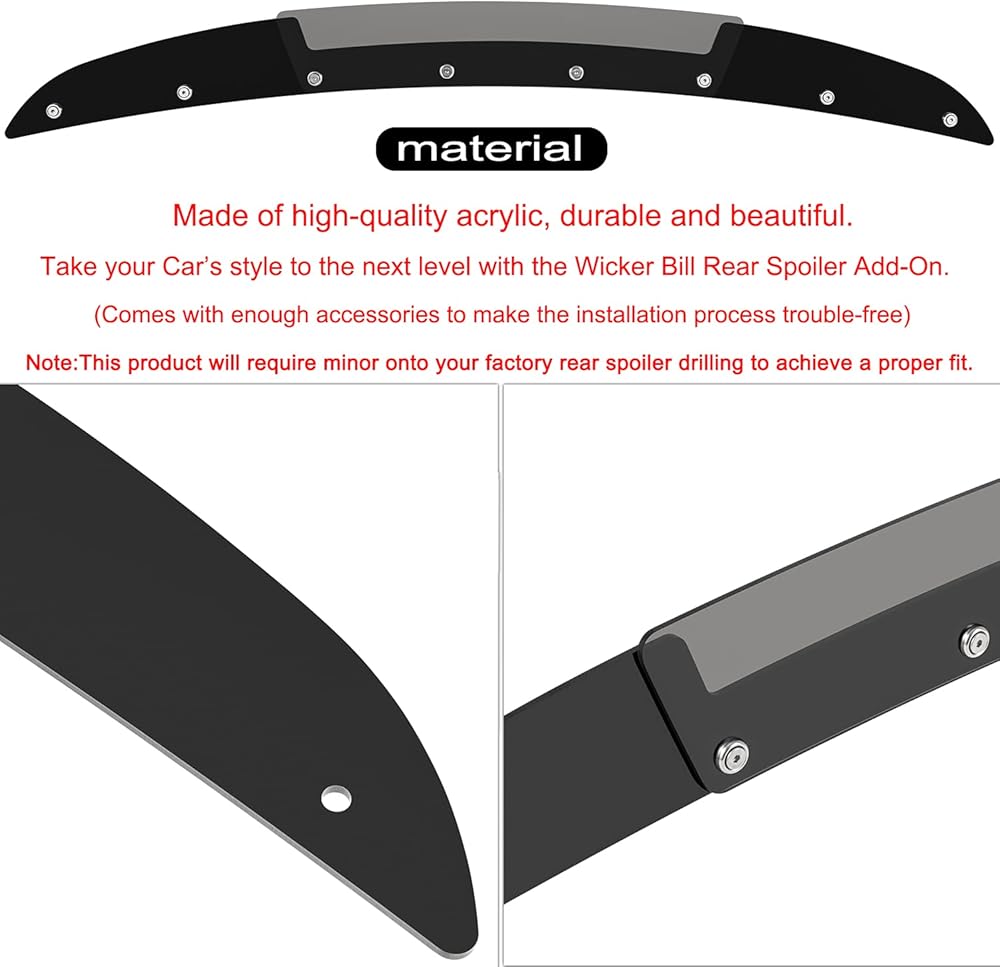 Superior Quality Material : Manufactured from high quality Acrylic , this Rear Wicker Bill Spoiler was designed using the original OEM CAD data from car to ensure a perfect fit. Acrylic is an extremely durable material known for its light-weight, superior durability and impact resistance.