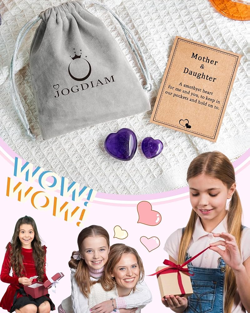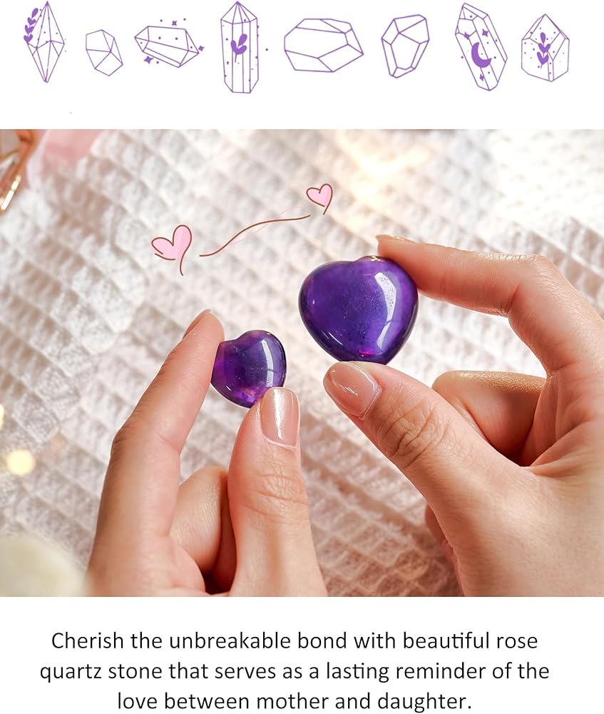 A warm way to express the unbreakable bond between mother and daughter with our Heart Rose Quartz Crystal Set. This exquisite set features two Heart Rose Quartz crystals that have been crafted to symbolize love and warmth. Each set includes a 1.2" heart stone for Mom and a slightly smaller 0.8" heart stone for her daughter, making it a gift that visually expresses the closeness and continuity between the two. These hand-selected rose quartz crystals are not only beautiful, but also meant to strengthen the loving bond between a mother and her daughter. Mom and Daughter Gifts: Celebrate the unique and loving relationship between mothers and daughters. Thoughtful for mother's birthday gifts, daughter's birthday gifts, and any special occasion. Touching Symbolism: Each stone heart is a timeless token of love and a daily reminder of the bond you share. Back to School Gift: Send your daughter back to school with a piece of her heart at home, reassuring her that mom's love is always with her.