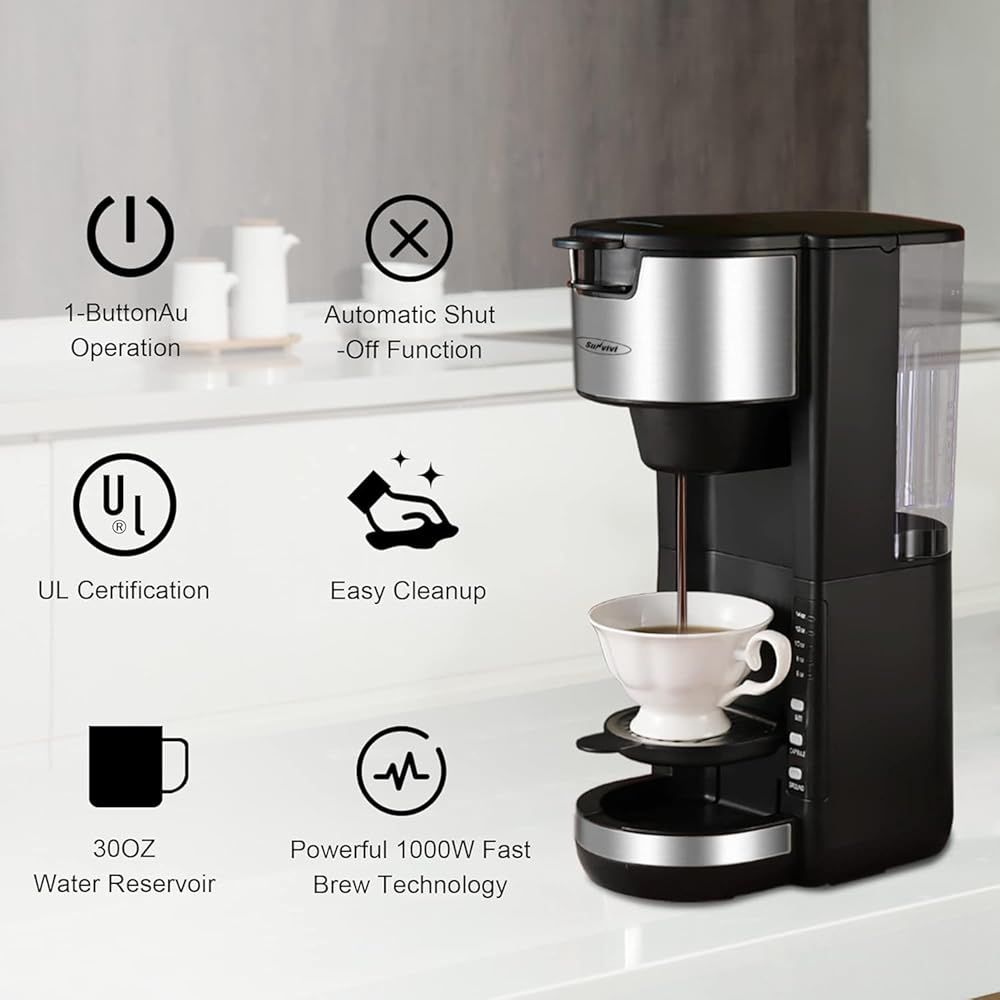 ماكينة صنع القهوة الفردية لكوب K والقهوة المطحونة، ماكينة صنع القهوة بكوب واحد من 6 إلى 14 أونصة، ماكينة صنع القهوة بماء 30 أونصة، صينية تنقيط قابلة للتعديل ووظيفة الإغلاق التلقائي