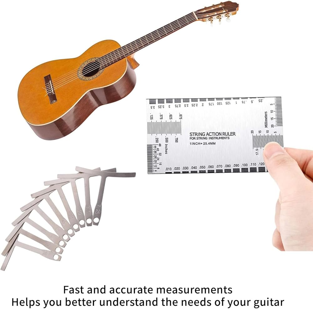 🎵【مادة تدوم لفترة أطول】 جميع أدوات قياس الجيتار مصنوعة من الفولاذ المقاوم للصدأ مع حواف ناعمة لا تحتوي على نتوءات، ومضادة للصدأ والخدوش، ومتينة لخدمة جيتارك لفترة طويلة.