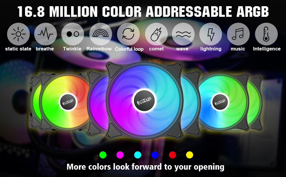 【تأثير ضوئي متعدد الأوضاع】توهج أحادي اللون، وتغيير أحادي اللون وتأثير قوس قزح. تم تجهيز المروحة الواحدة بـ 8 خرزات ARGB LED و6 ألوان و10 أوضاع لتأثيرات الضوء. يمكن التحكم في تأثير الإضاءة للمروحة الواحدة بواسطة برنامج اللوحة الأم. يمكن أيضًا استخدام هذه المروحة الفردية مع مراوح سلسلة Moonlight 3 في 1.