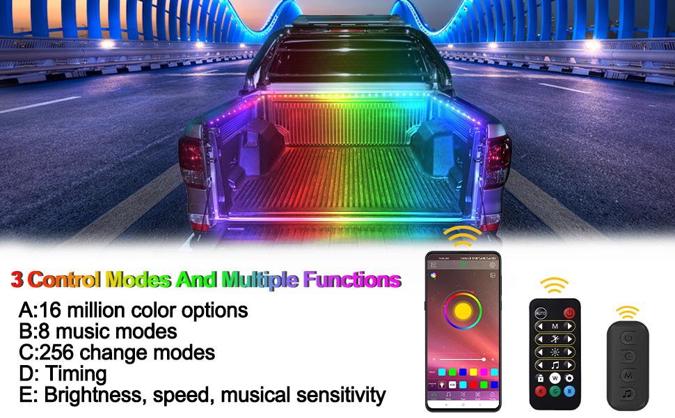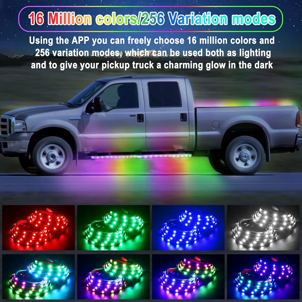 مصابيح LED لسرير الشاحنة الذكية: يحتوي مصباح سرير الشاحنة Dreamcolor Chasing على 16 مليون لون للاختيار من بينها، 8 أوضاع موسيقى، 256 وضعًا لتغيير الضوء، يمكن ضبط السطوع والسرعة والحساسية للموسيقى، من خلال التطبيق، يمكنك تصميم اللون والوضع المفضل لديك .
