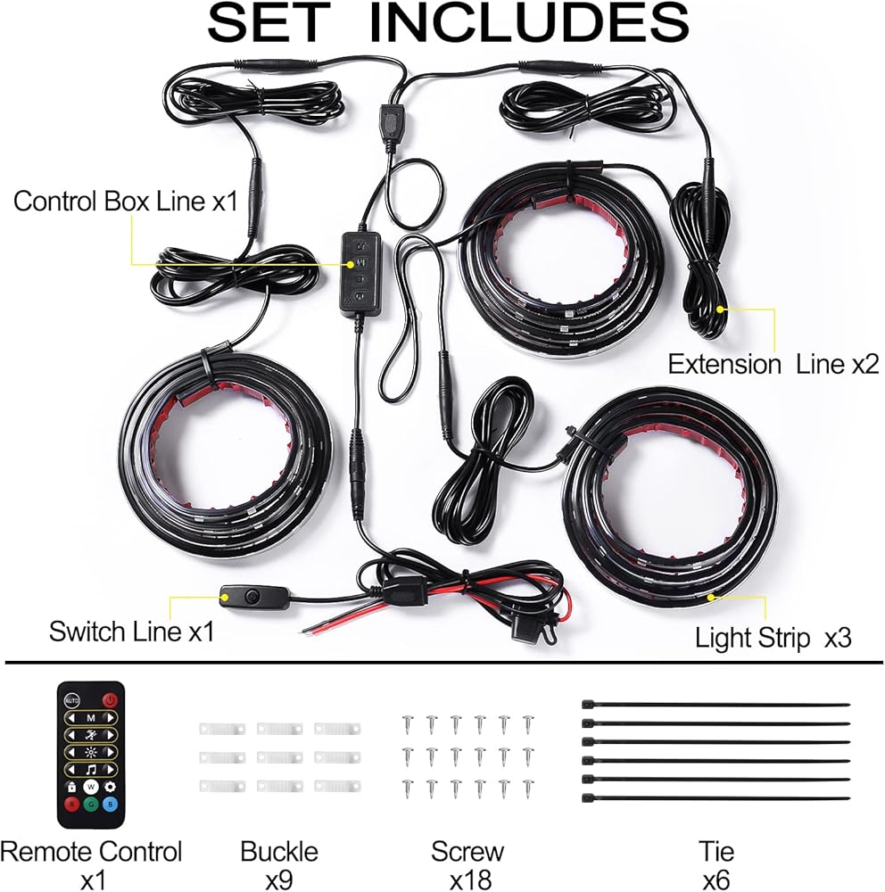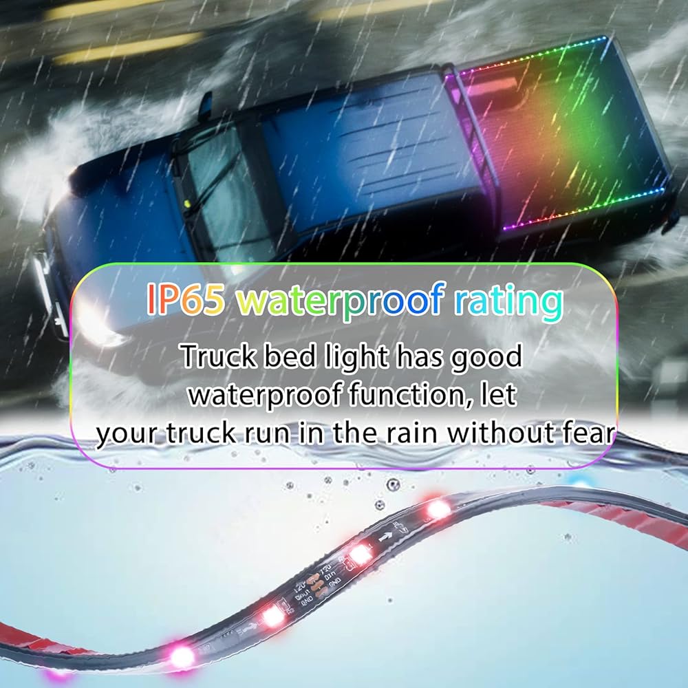 سهولة التركيب: تأتي مصابيح RGB LED للشاحنات مع شريط على الوجهين. ما عليك سوى إزالة الشريط ذي الوجهين لتوصيل مصابيح LED لسرير الشاحنة بشاحنتك. وهي مجهزة بمسامير وأبازيم وروابط كابل وأسلاك تمديد لسهولة التركيب