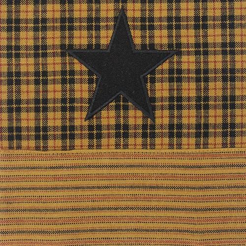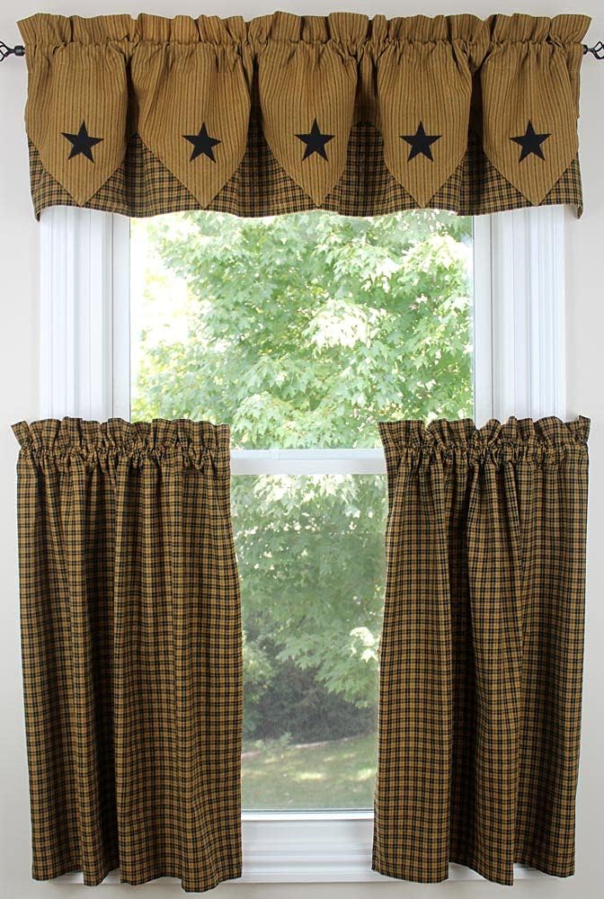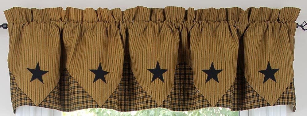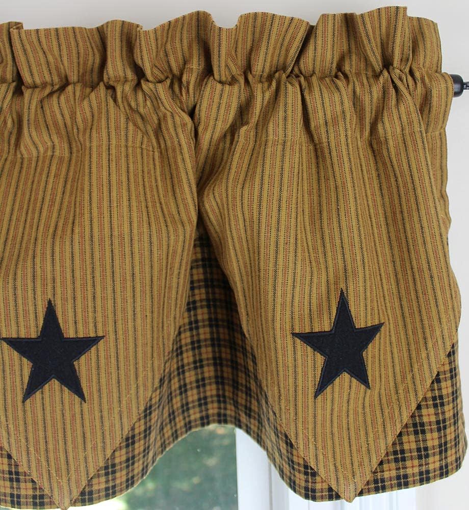The Primitive Star Lined Point Valance is 72" wide by 15" long and features stripe with black star appliques over a black, gold and wine plaid. The valance has a 2" header and a 2.5" rod pocket. Made from 100% cotton and lined. Priced and sold individualy. Pair with coordinating tiers to complete the look. Additional window treatments, shower curtain and decorative towel also available. Designed and manufactured exclusively for Primitive Home Decors.
