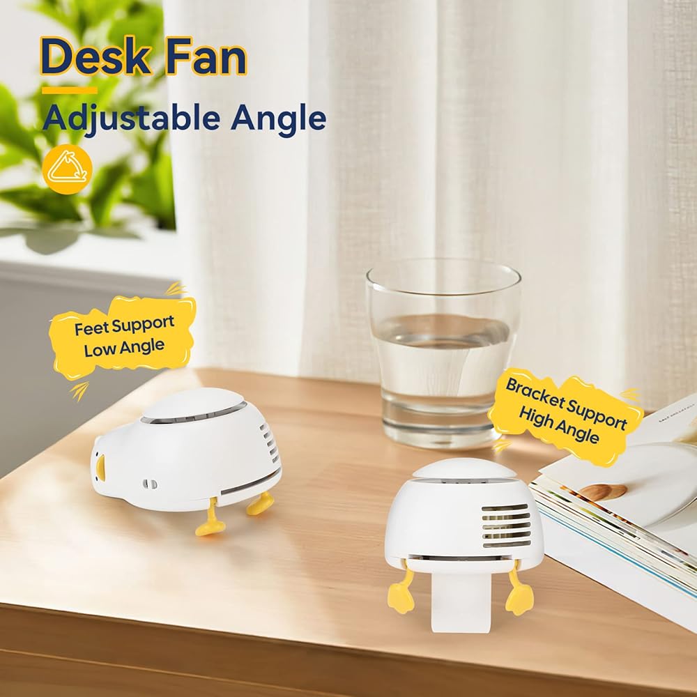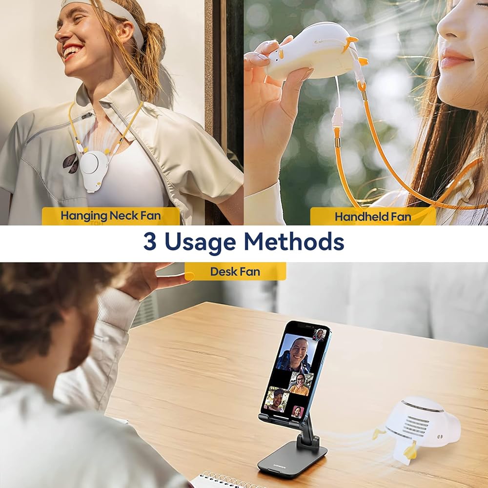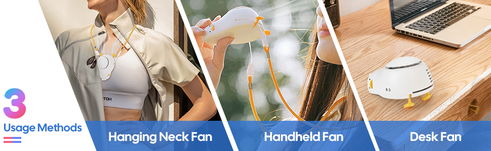 • Hands-free and Adjustable Bracket Thanks to the latest detachable lanyard and foot bracket design, you can go from a handheld fan to a desktop fan or a hands-free hanging neck fan in one second. As a desk fan, we have two angles that can be adjusted: duck feet support to adjust the angle (low angle), and hidden bracket under the belly to adjust the angle (high angle).